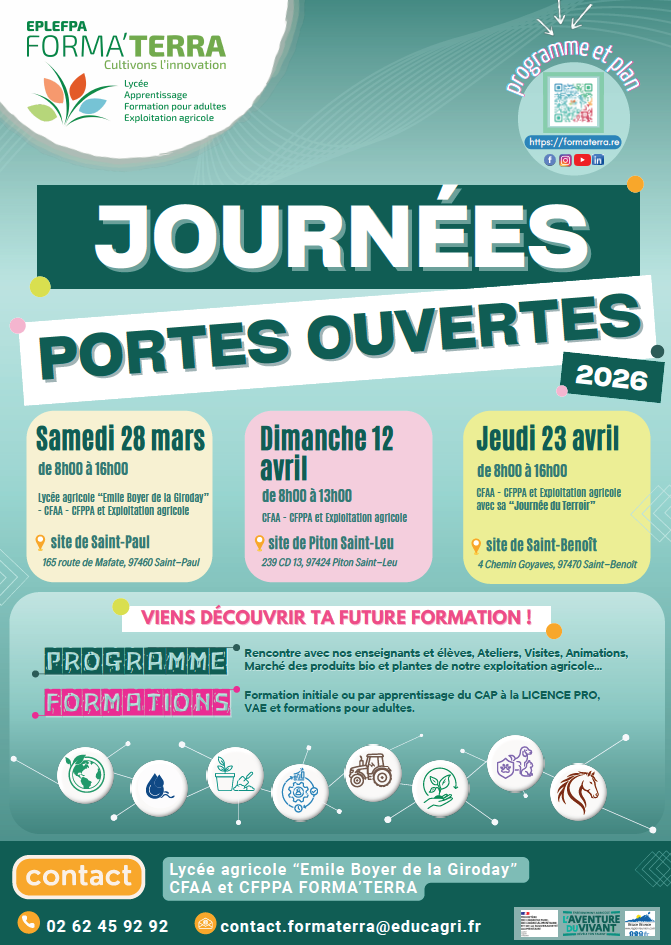 Dans le cadre de lâorientation des Ă©lĂšves de 3e, le collĂšge invite les Ă©lĂšves et leurs familles Ă dĂ©couvrir les formations proposĂ©es par lâĂ©tablissement FORMAâTERRA, Ă travers ses journĂ©es portes ouvertes 2026.