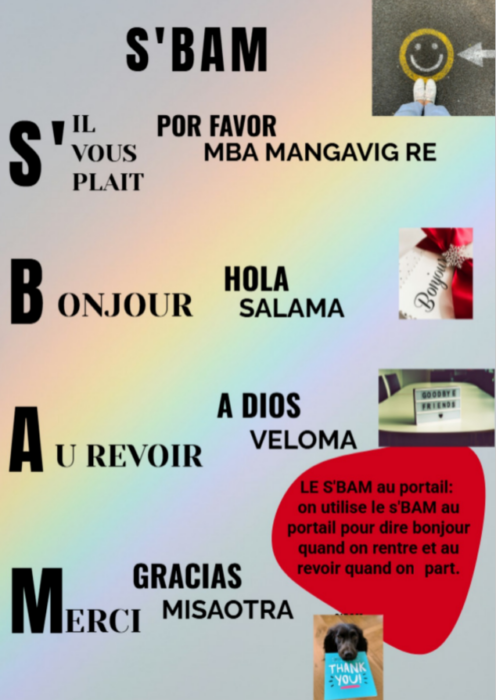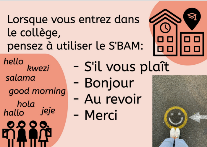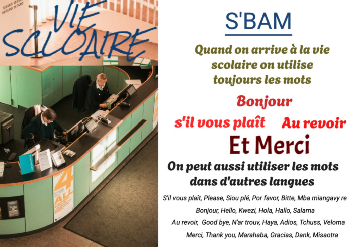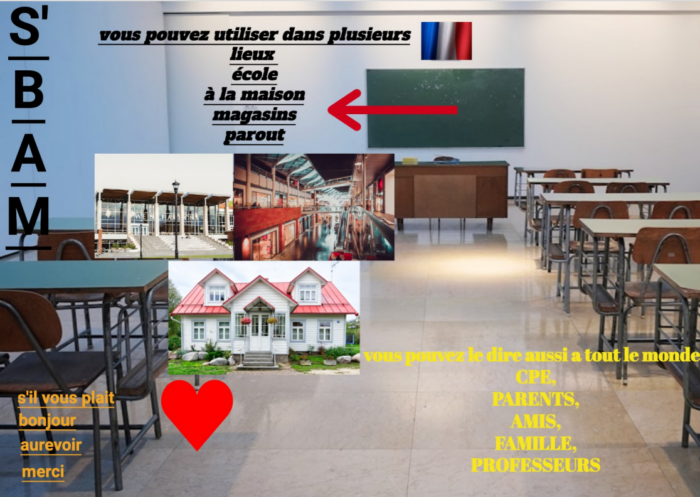 Inspiré de la technique commerciale de Gérard Mulliez basé sur le SBAM (Sourire, Bonjour, Au revoir, Merci), les élèves de 511 l’ont transformé en S’BAM au Collège Mille Roches pour :