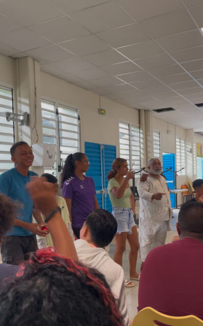 Cinq classes de 3e du collège ont pu profiter de la pièce de théâtre intitulée Victoire Magloire dit Waro. Une représentation en créole et en français qui retrace le parcours d’un Réunionnais depuis son recrutement jusqu’à son retour sur l’île, où il retrouve sa bienaimée Rolande, après avoir combattu vaillamment en Europe pendant la Première Guerre mondiale (1914-1918). La pièce, pleine d’humour tout le long, mêle une utilisation poétique du français et du créole et a fait participer les élèves au jeu d’acteurs.
