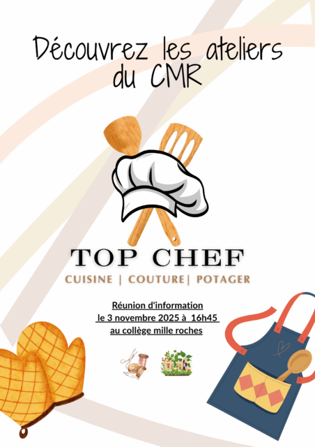 Vous aimez cuisiner ? Vos enfants aussi ? Avec ou sans eux, venez participer au concours Top Chef du Collège Mille Roches ! Le 1er prix ? Un repas dans un restaurant gastronomique ! Une réunion d’informations aura lieu le lundi 3 novembre à 16H45 au collège : vous aurez la réponse à toutes […]