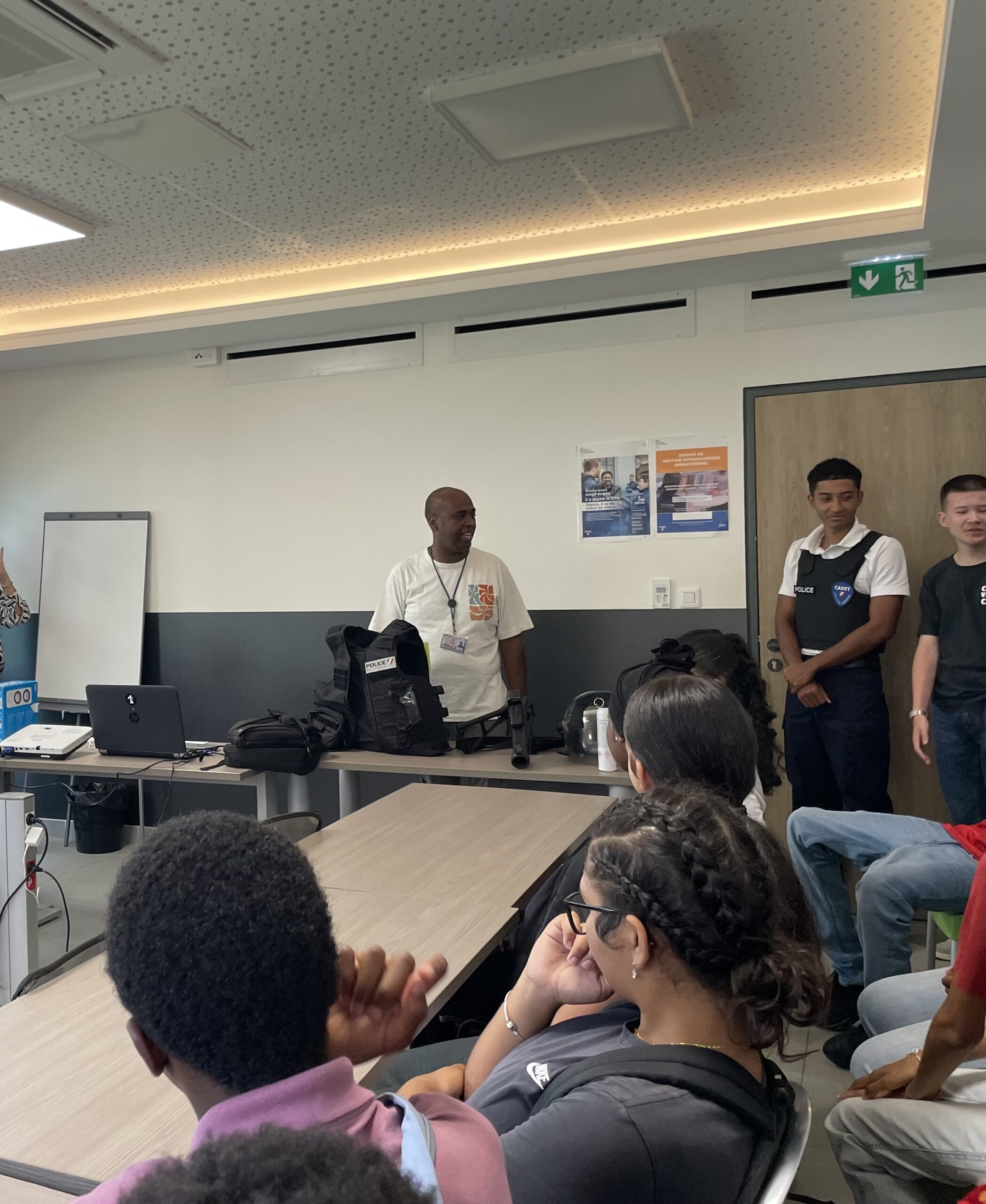 Nous, les élèves de la classe Défense, avons visité le commissariat de Saint-André où nous sommes allés avec Mme Lefranc-Prusse et M. Pinot. Nous avons été très bien accueillis par Luciano Coissier. ils nous a fait visiter les bâtiments comme par exemple les cellules de garde à vue. Nous avons participé à un atelier sur la légitime défense avec des vidéos. Il nous a montré les différentes types d’armes que la police nationale utilise. A la fin, nous avons regardé une vidéo sur le métier de policier et les missions de la Police nationale.