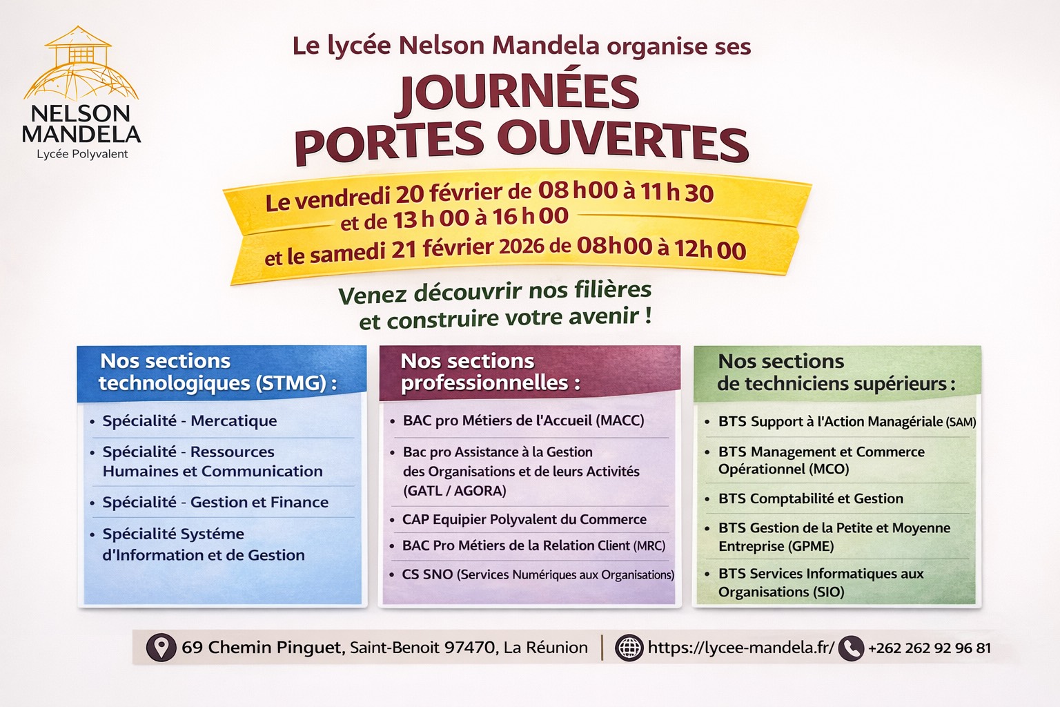 Journées Portes Ouvertes 29 janvier 2026 29 janvier 2026 Forum des métiers JPO mercredi 25 février 2026 de 8h30 à 12h00