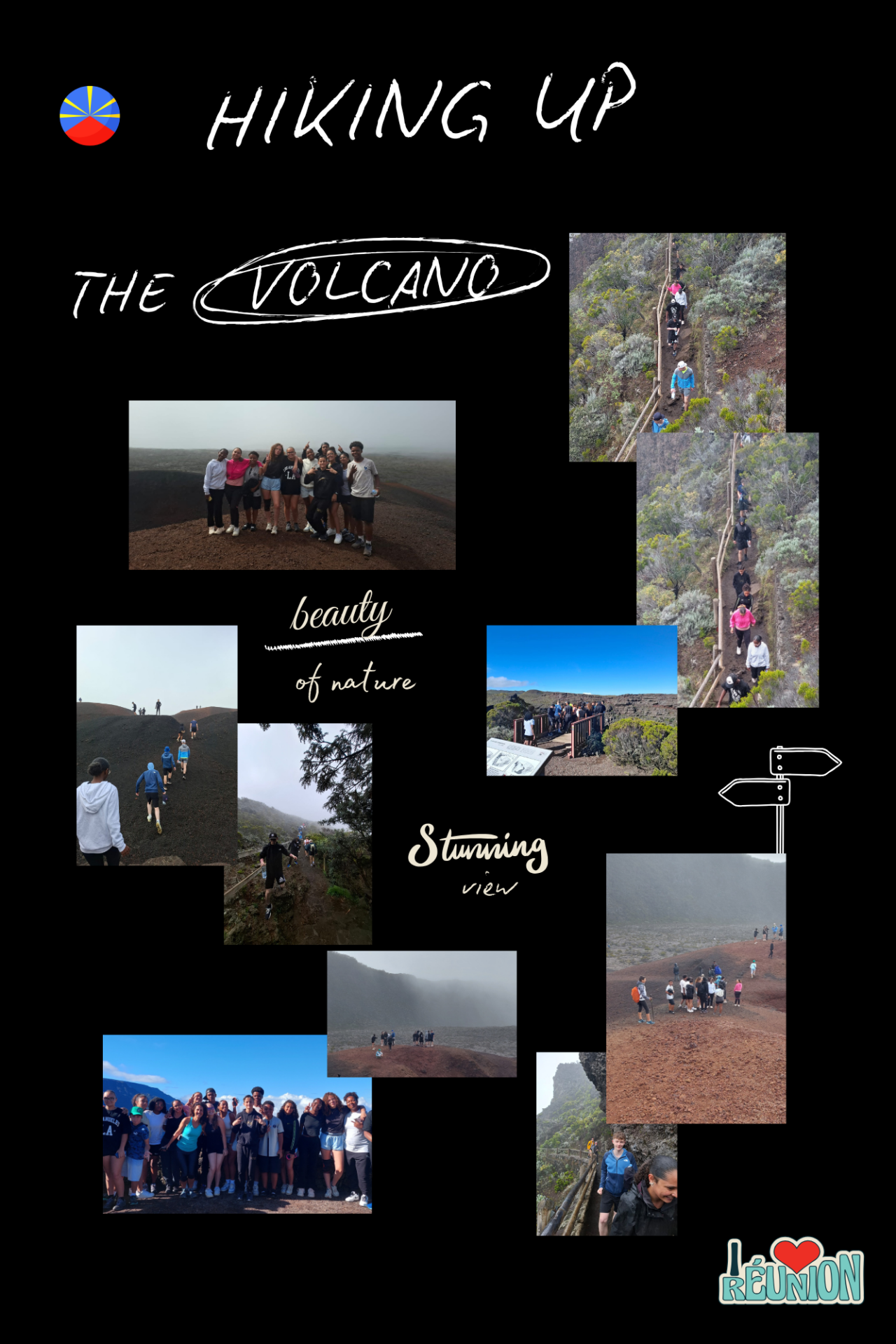 On Friday, we went to the volcano with our pen pals. They joined us at 7:30am to take the private bus together. During the trip we stopped on some viewpoints like Nez de Boeuf, Rivière des Remparts, Cratère Commerson. Before we arrived at Pas de sable the teachers made us close our eyes and open them again to be amazed by the beautiful viewpoint over the Pas de sable. When we were hiking it was raining a little bit and we walked until Formica Léo. We had lunch at Bois Court (L’horloge) and then we admired the viewpoint before going back to the college.
