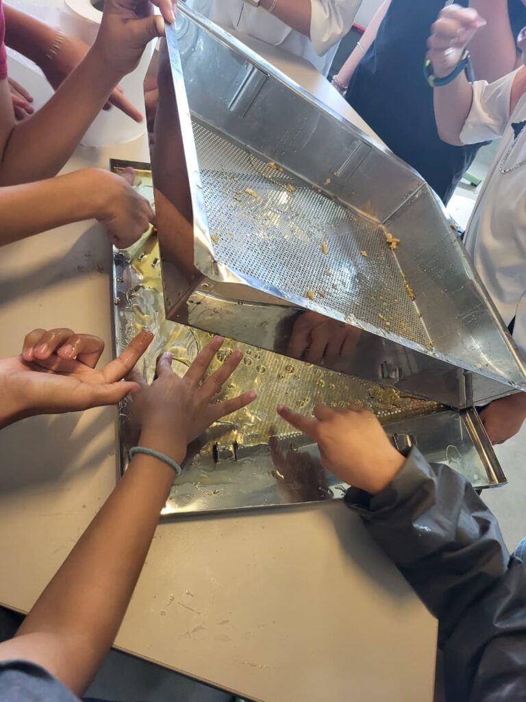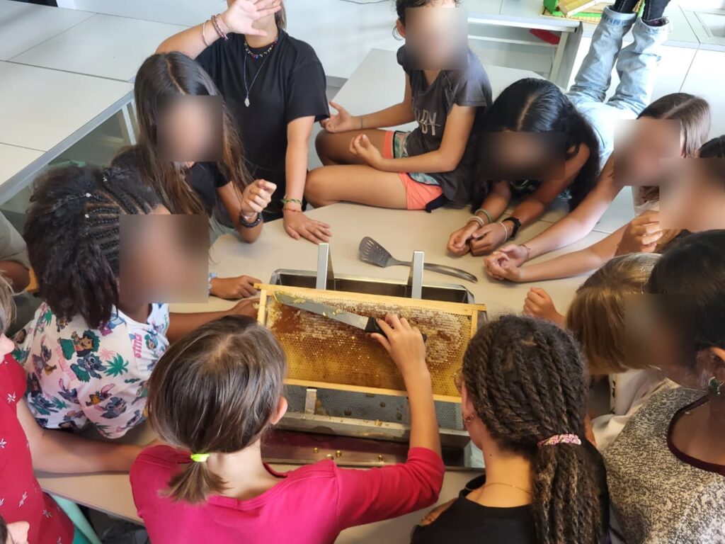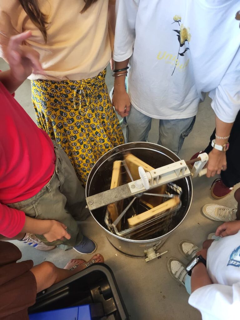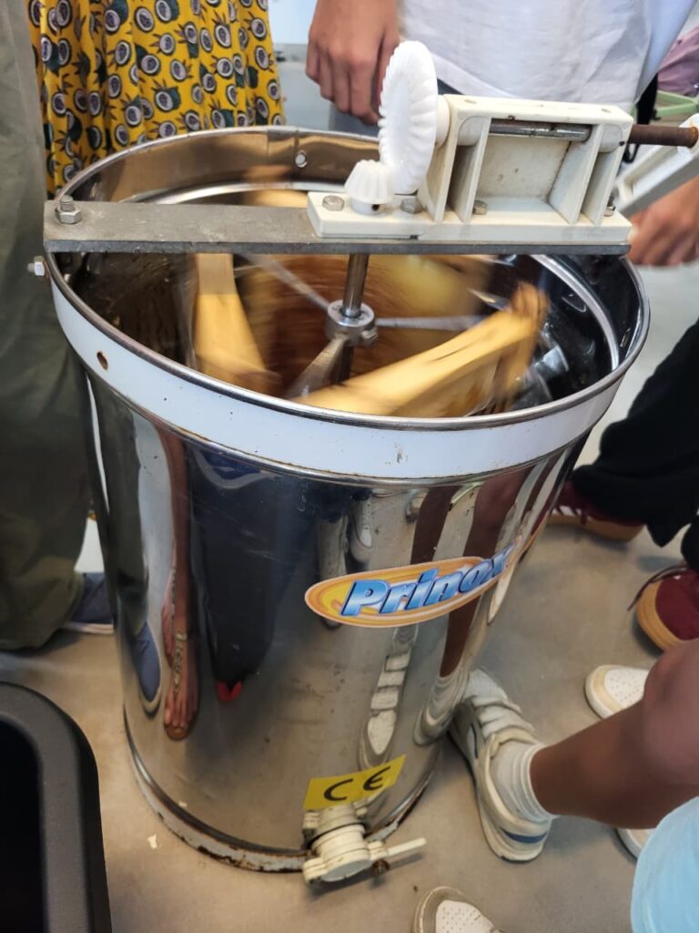 Les élèves ont pu découvrir toutes les étapes de l’extraction : enlever la cire, faire tourner l’extracteur, observer le miel qui coule doucement… Beaucoup n’avaient jamais vu ça, et l’enthousiasme était au rendez-vous.