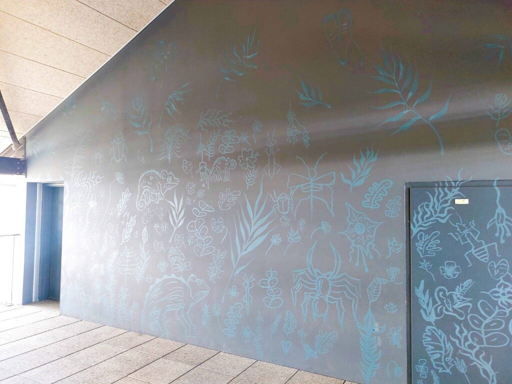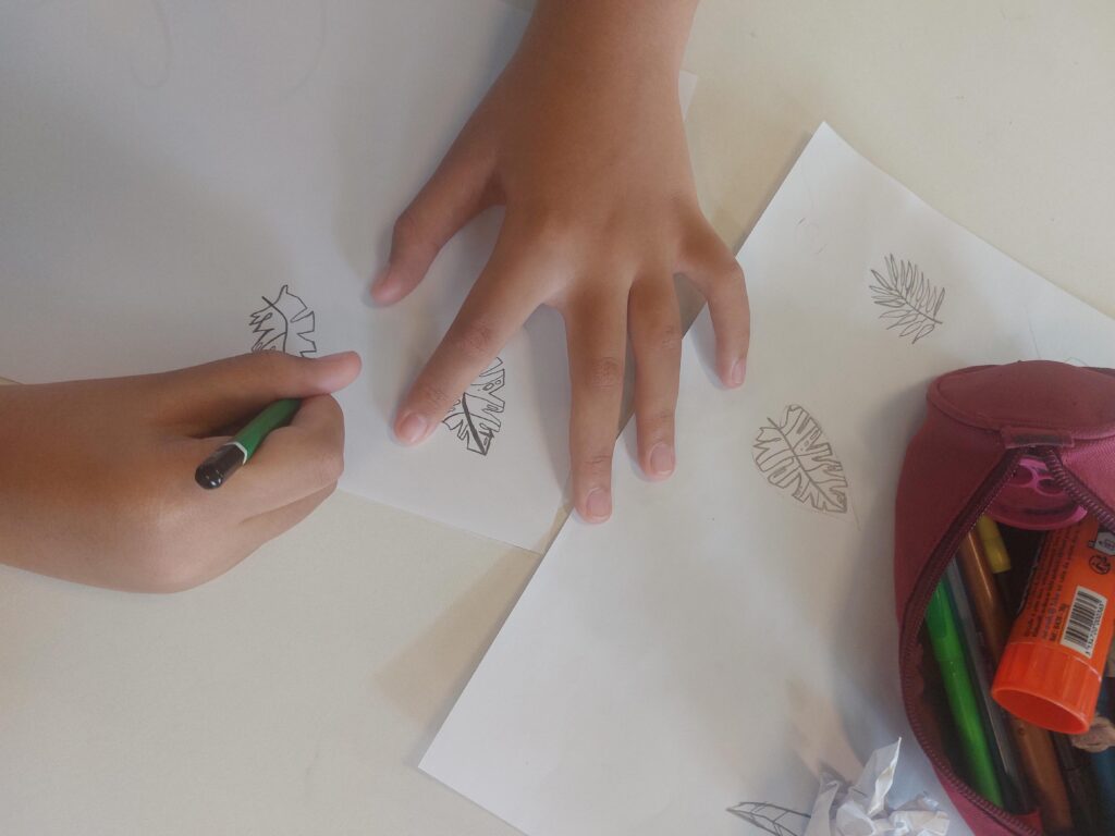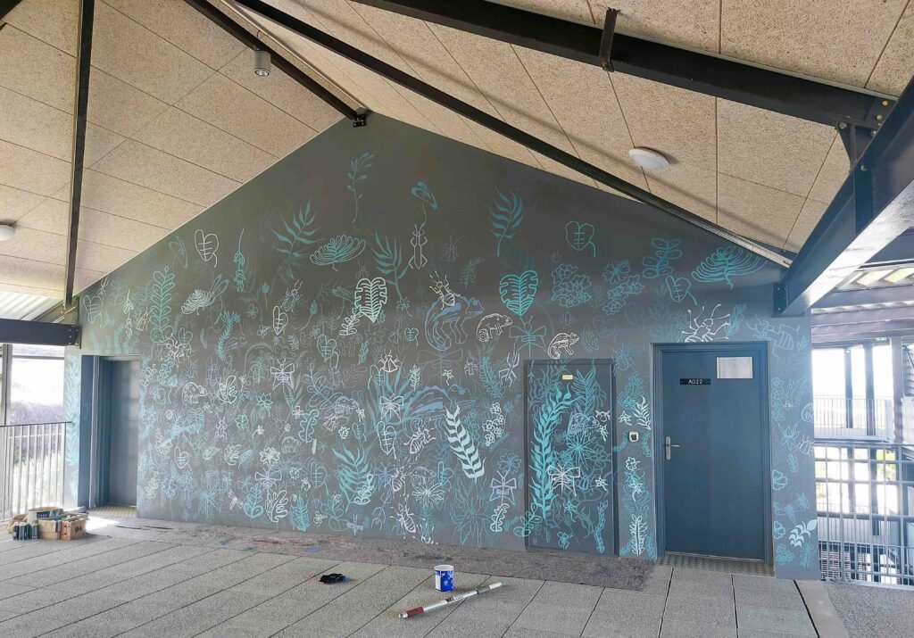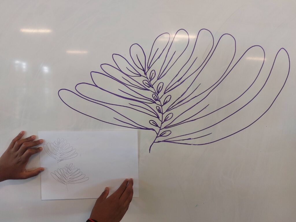 Ils ont réalisé un ensemble de productions préparatoires pour le mur autour de la faune et de la flore .Ce sont des dessins au trait, aux formes synthétiques qu’ils vont devoir répéter, comme une écriture, sur la surface du mur.