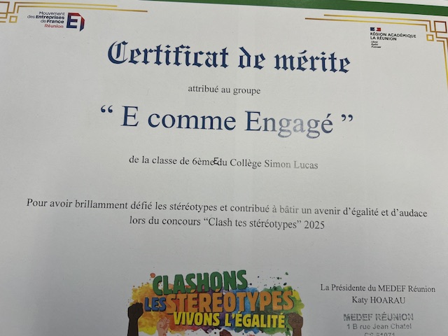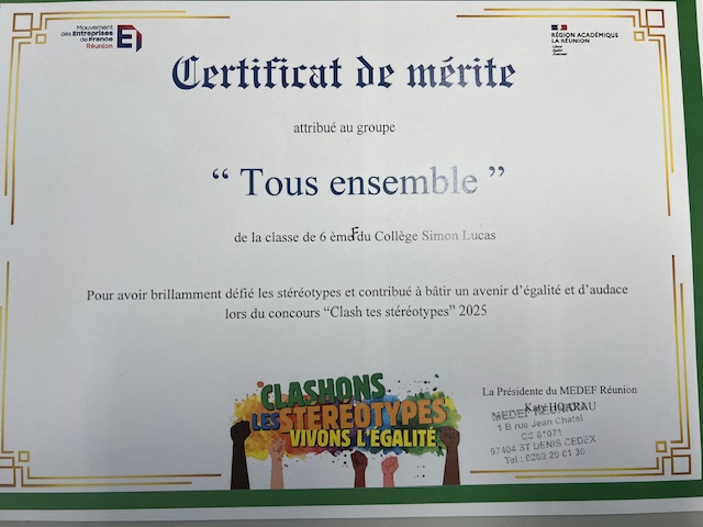 Les 6E et F qui ont participé au concours « Clash tes stéréotypes » organisé par le MEDEF Réunion, ont eu le plaisir d’être récompensés pour leur travail sur les stéréotypes concernant les filles et les garçons par le diplôme de mérite que voici.