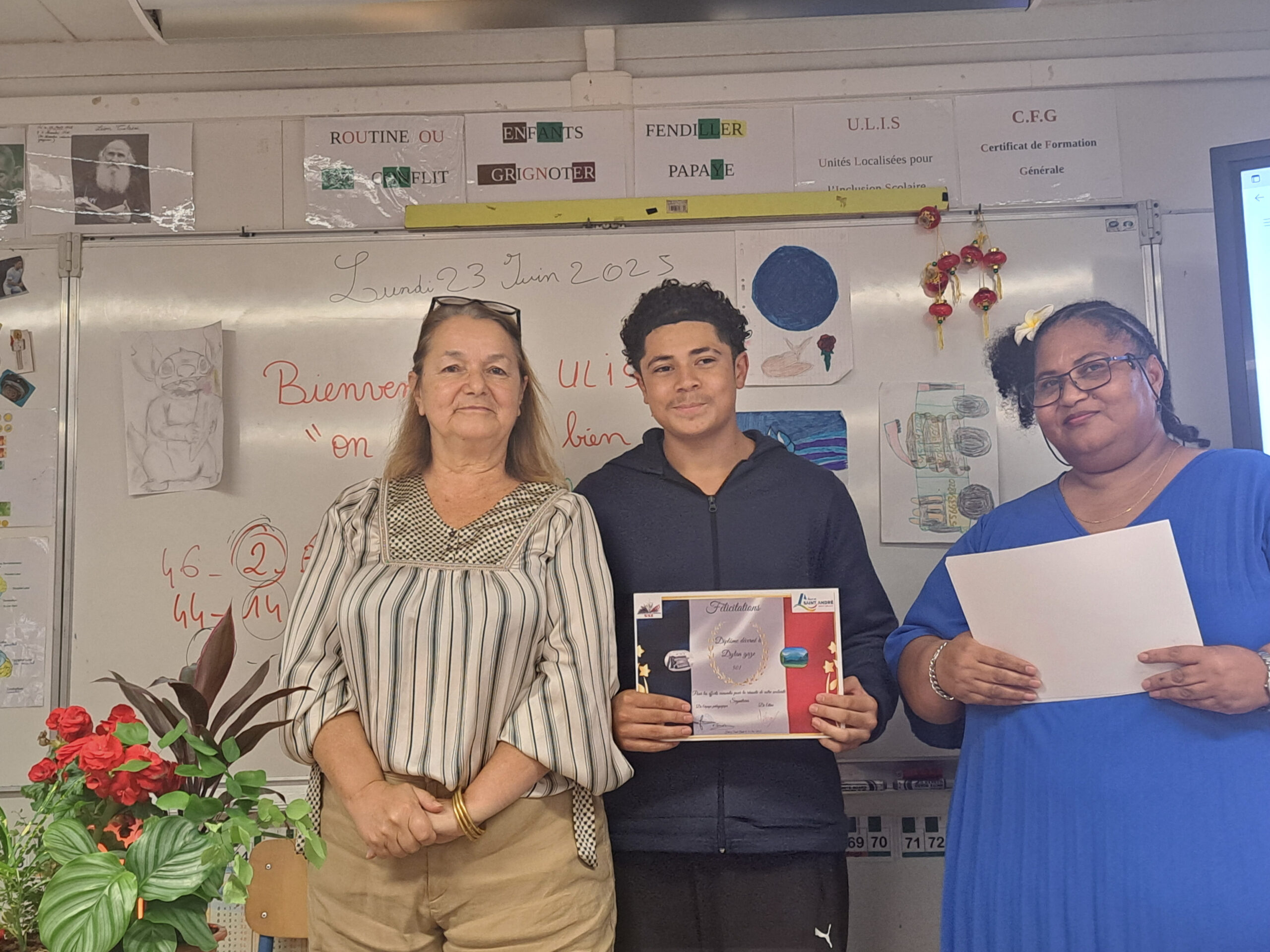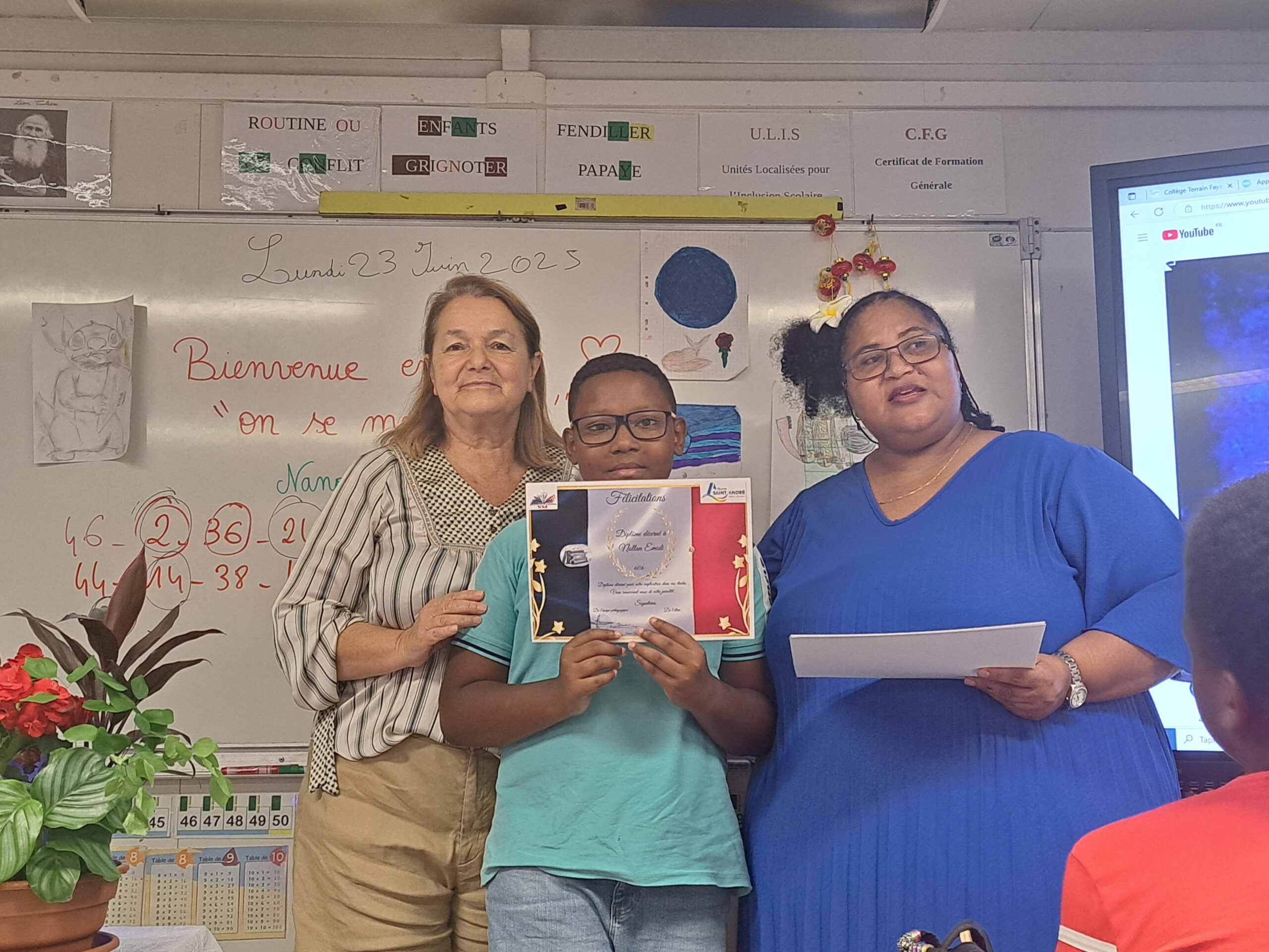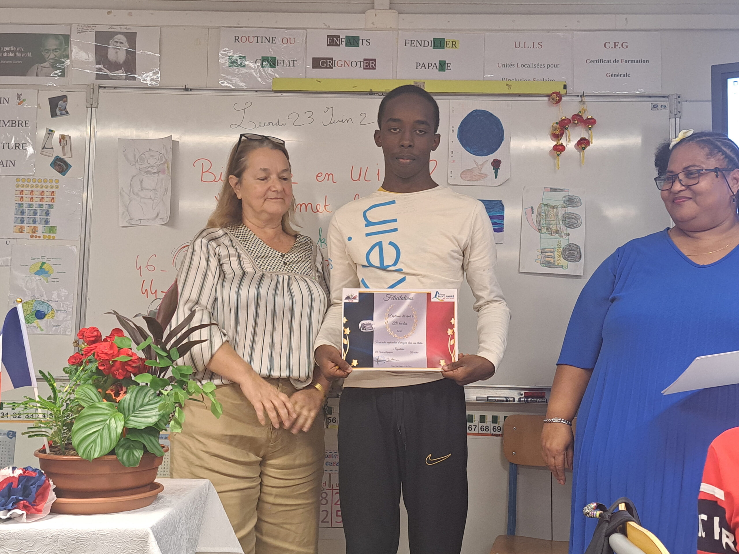 En M4, la version courte de la Marseillaise a lancé la cérémonie de récompenses entrecoupée par nos talentueux chanteurs: Sayel, Nollan et Melvin. En présence de Madame SAKOT, M.TURPIN, des CPE, infirmière et de collègues , les élèves ont reçu leur diplôme personnalisé non sans émotions ainsi qu’un petit sac de douceurs et de petits matériels scolaires.