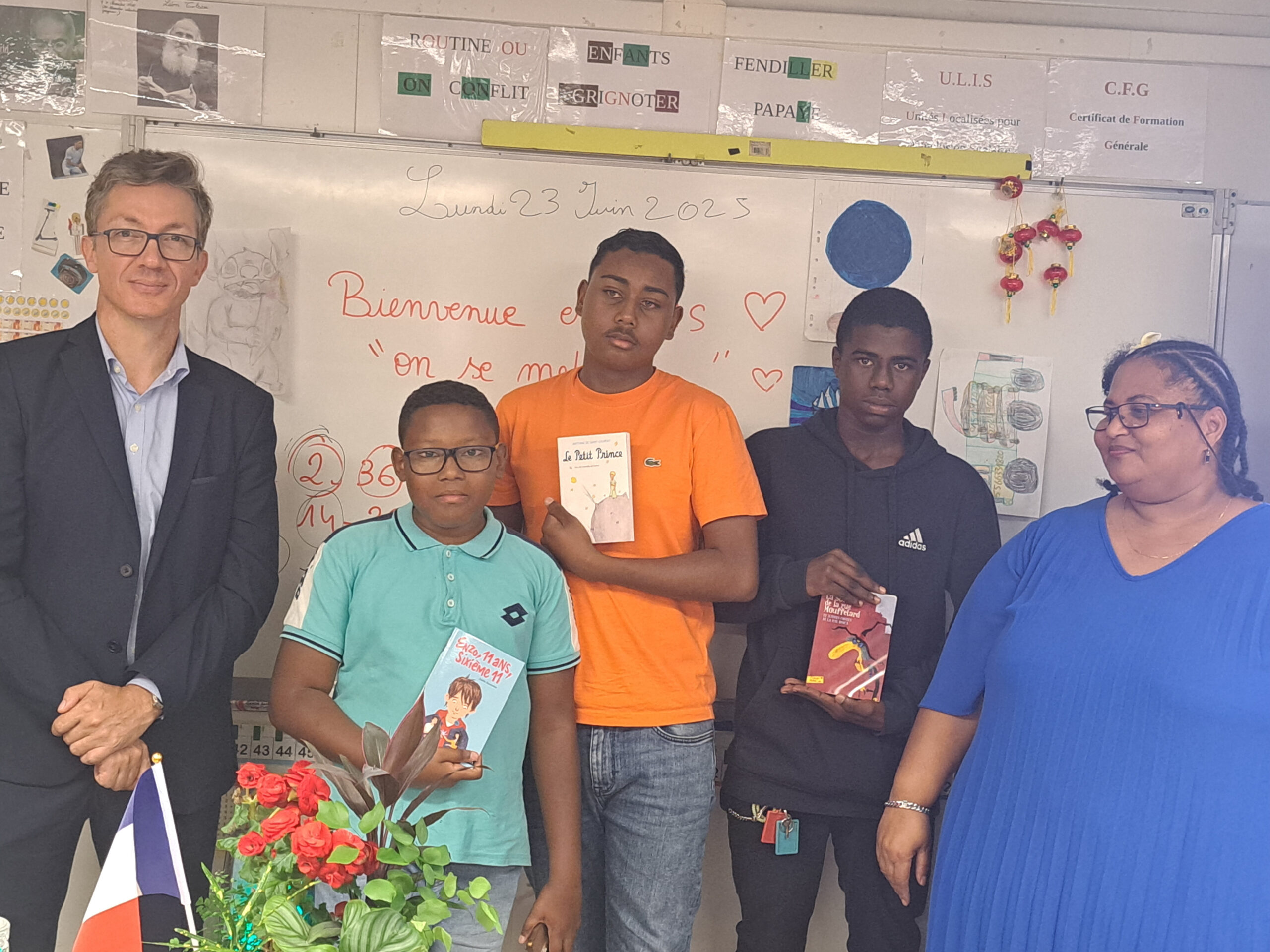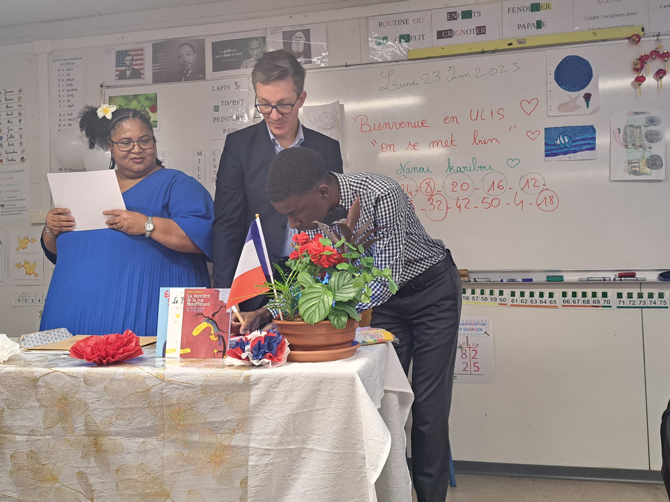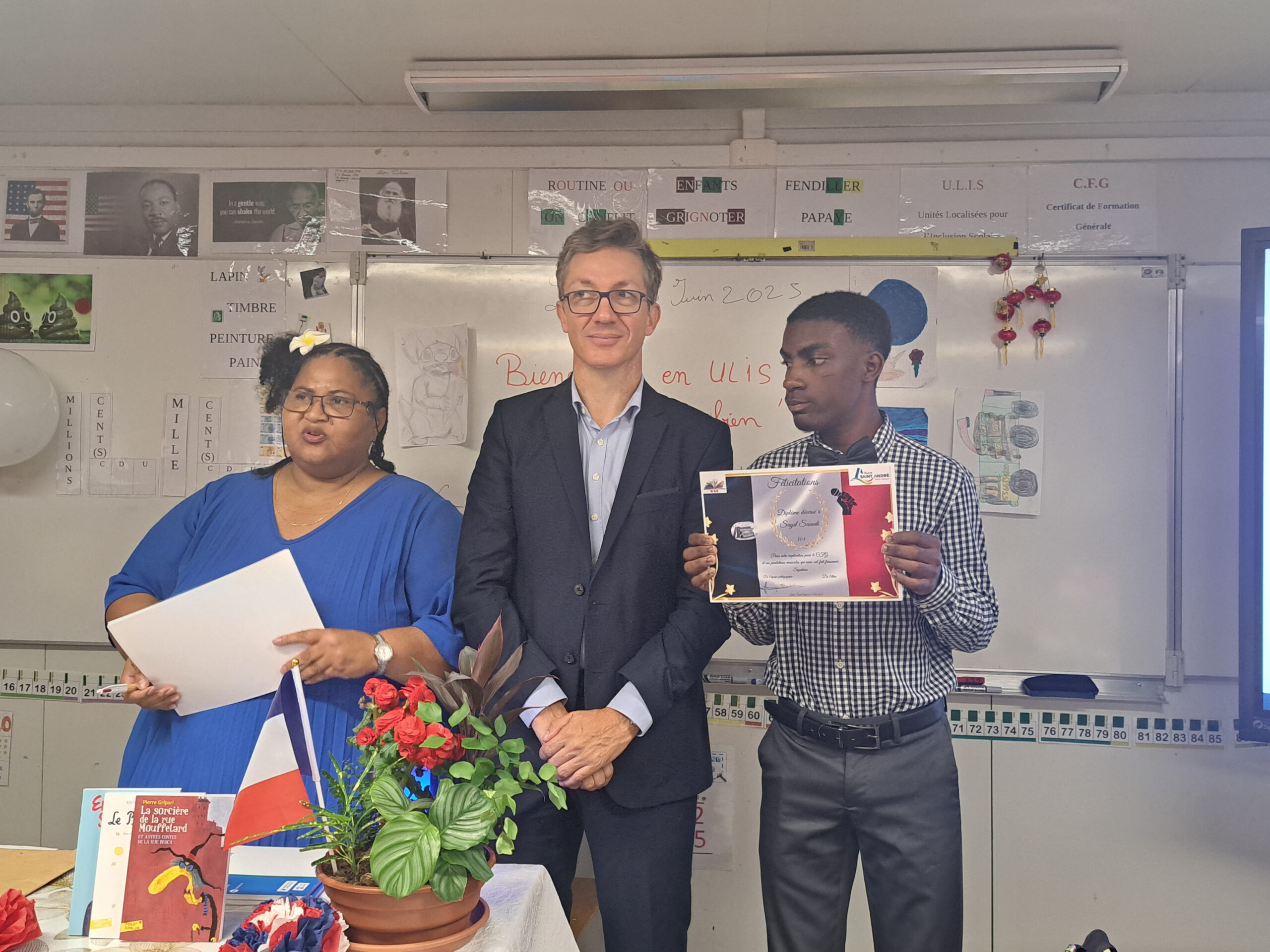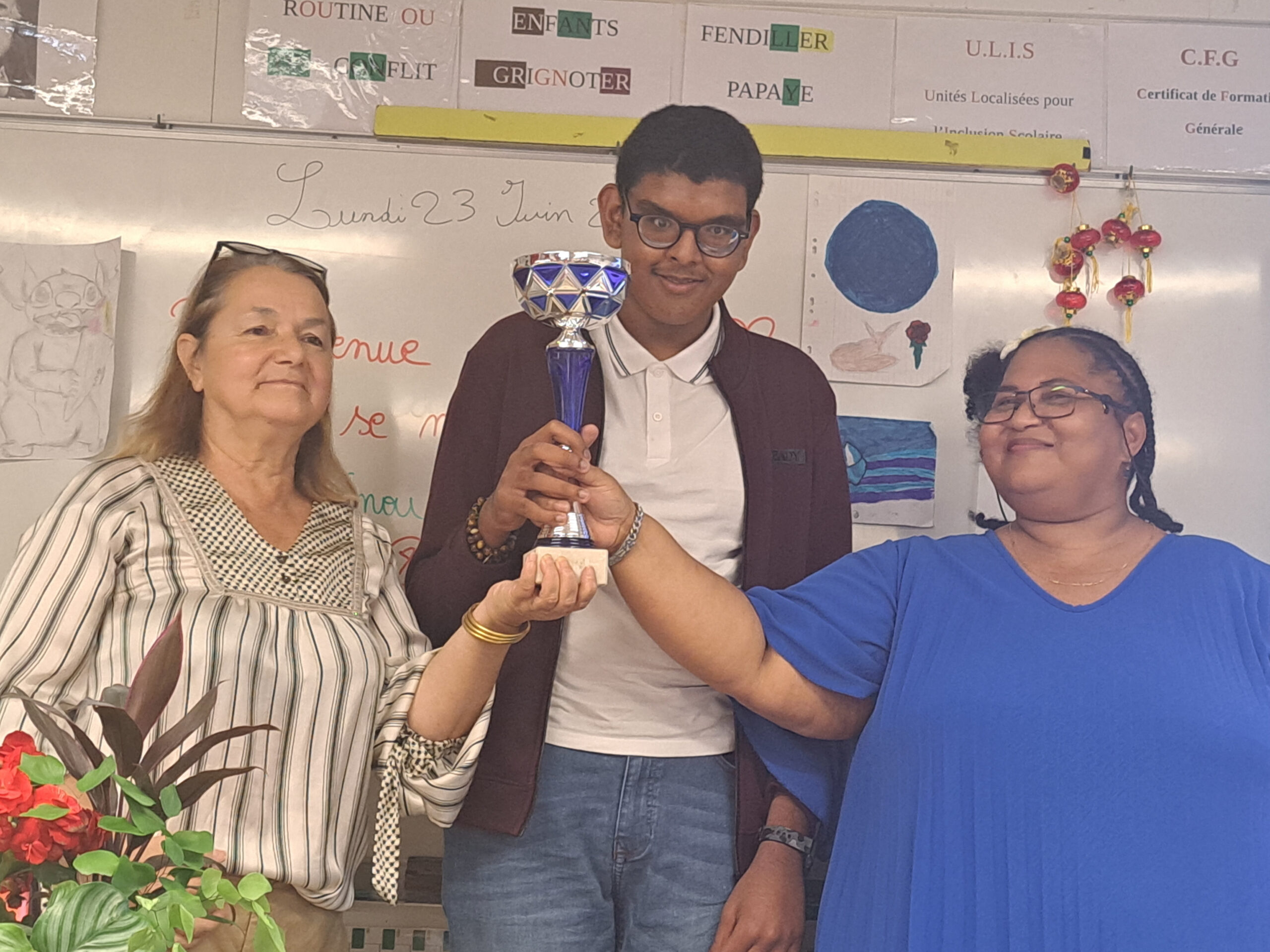 En M4, la version courte de la Marseillaise a lancé la cérémonie de récompenses entrecoupée par nos talentueux chanteurs: Sayel, Nollan et Melvin. En présence de Madame SAKOT, M.TURPIN, des CPE, infirmière et de collègues , les élèves ont reçu leur diplôme personnalisé non sans émotions ainsi qu’un petit sac de douceurs et de petits matériels scolaires.