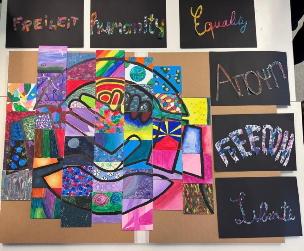 First we were in a group of six people and we had to think in groups about a word that best represented Democracy. After this we wrote our word on a piece of paper and we melted colored pencils on the word and then cut it. The final touch was to take the word and glue it on black paper.