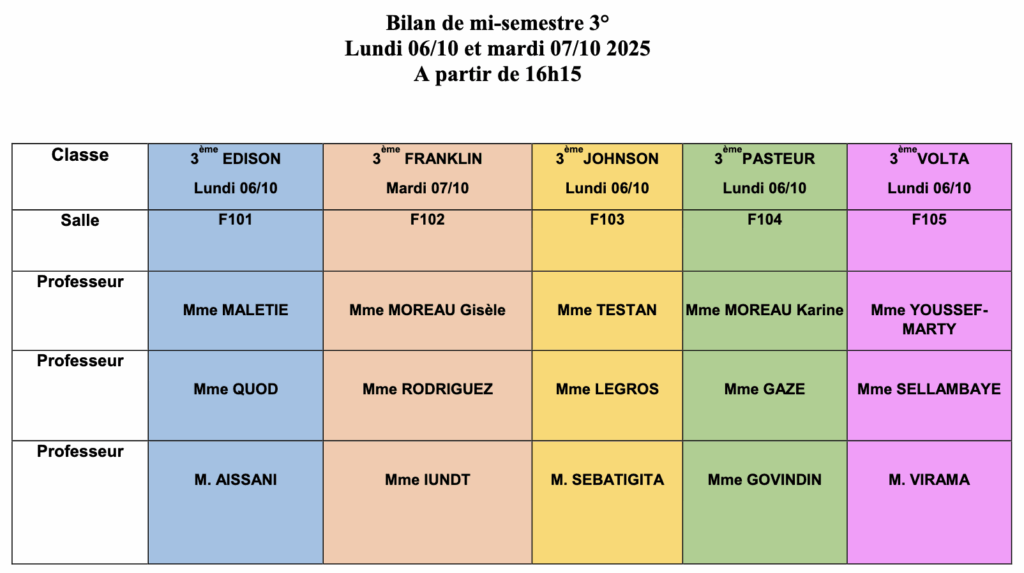 Le collège organise une rencontre Parents-Professeurs le lundi 6 et le mardi 7 octobre à partir de 16h15.