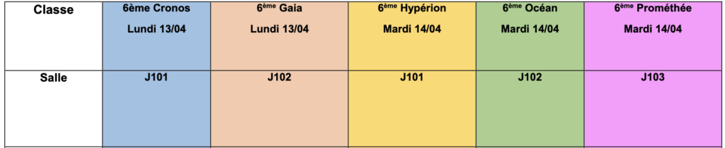 - Classes de 6e, 5e et 3e : lundi 13 et mardi 14 avril 2026