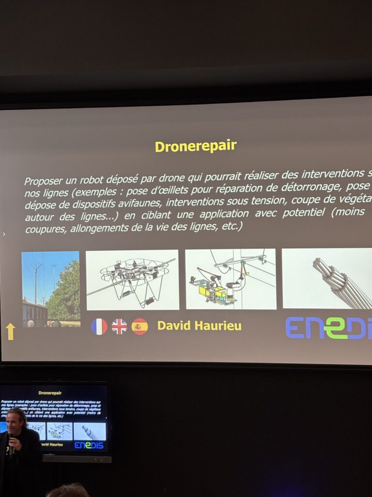En 24 heures, ils ont développé une idée de drone, qui, posé sur une ligne à haute tension, va réaliser une opération de maintenance sur un câble détérioré par la foudre. Ils conçoivent deux prototypes fonctionnels dont un motorisé !