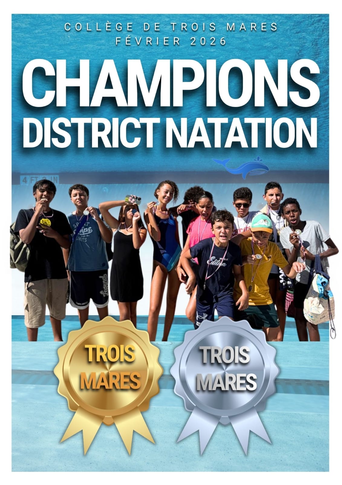 À l'issue de la compétition de natation organisée à la piscine Roland Garros au mois de février 2026, l’équipe 1 du collège de Trois Mares a terminé 1ère et a obtenu la médaille d’or 🥇.