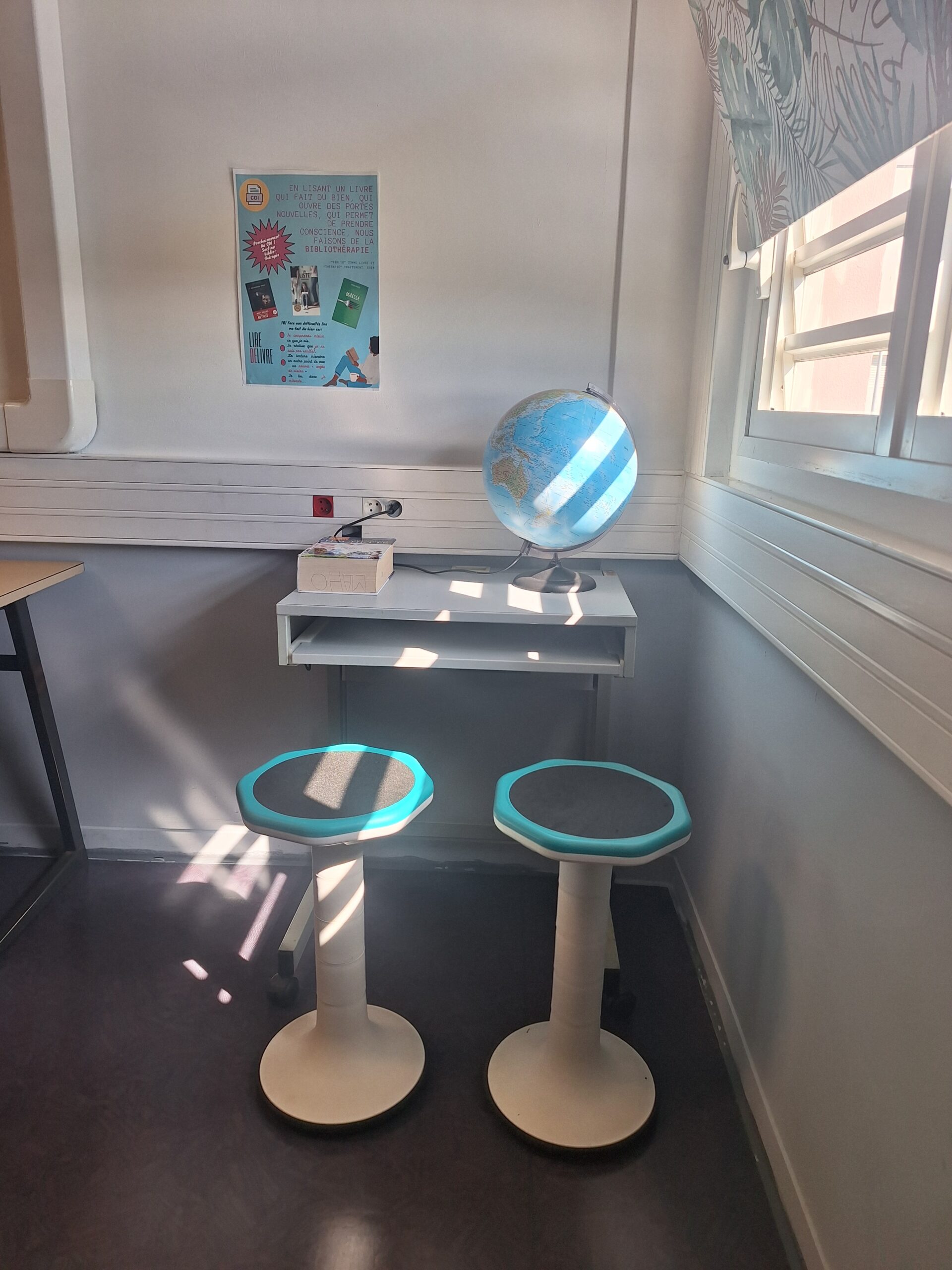 Les assises dynamiques (ballons, tabourets culbuto, sièges ergonomiques) permettent aux élèves de bouger sans déranger. Les casques anti-bruit offrent un espace de concentration à ceux qui en ont besoin. Le globe terrestre, lui, a déjà suscité des discussions passionnées sur le triangle des Bermudes ou le point Nemo.