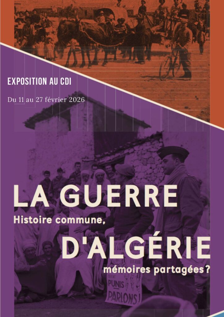 Du 11 au 26 février 2026, vous pourrez visiter une exposition du ONACVG (Office national des combattants et des victimes de guerre) sur la guerre d’Algérie au CDI intitulée «La guerre d’Algérie. Histoire commune, mémoires partagées ?». Elle retrace en 23 panneaux l’histoire de la conquête, de la colonisation, de la guerre et des différentes mémoires qui circulent aujourd’hui en France. Elle permet grâce à des images, des archives, des photographies ou des focus sur des personnages ou des lieux, de mieux comprendre la complexité de l’histoire et de son impact sur le présent.