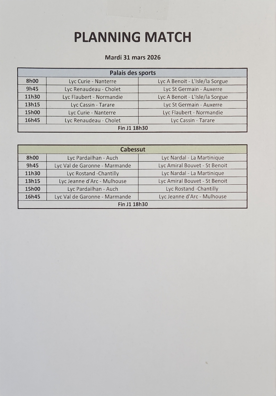 Aujourd’hui, mardi 31 mars, jour J. Le 1er match est à 9H45 (11h45 RUN). Ils joueront 4 périodes de 8 minutes contre le lycée Val de Garonne (académie de Bordeaux). Les joueurs sont sérieux, concentrés et determinés….