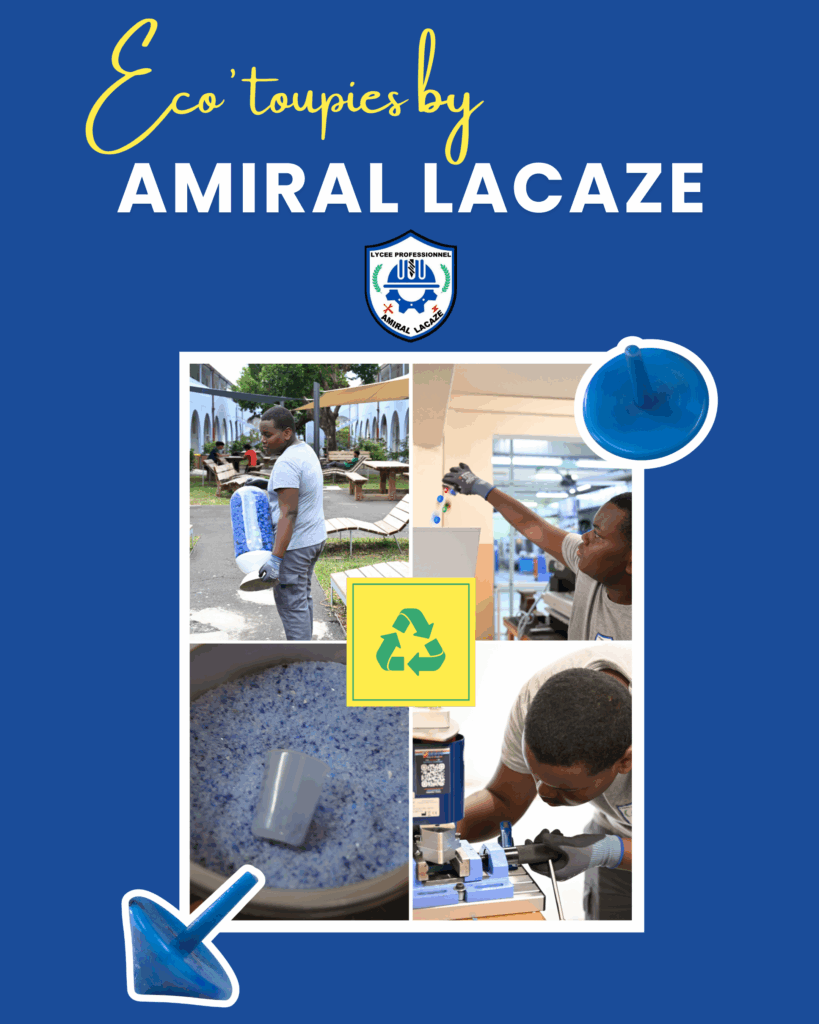 Les étudiants de Bac pro Plastiques et Composites visitent des établissements scolaires pour y installer des tirelires de collecte de bouchons en plastique. Ces bouchons sont ensuite recyclés pour fabriquer des toupies, que les étudiants distribuent aux jeunes.