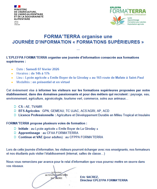 L’EPLEFPA FORMA’TERRA organise une journée d’information consacrée aux formations supérieures le :