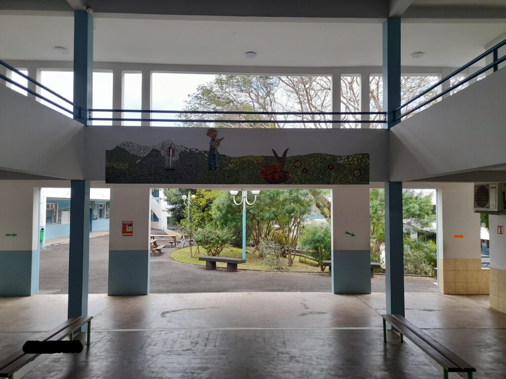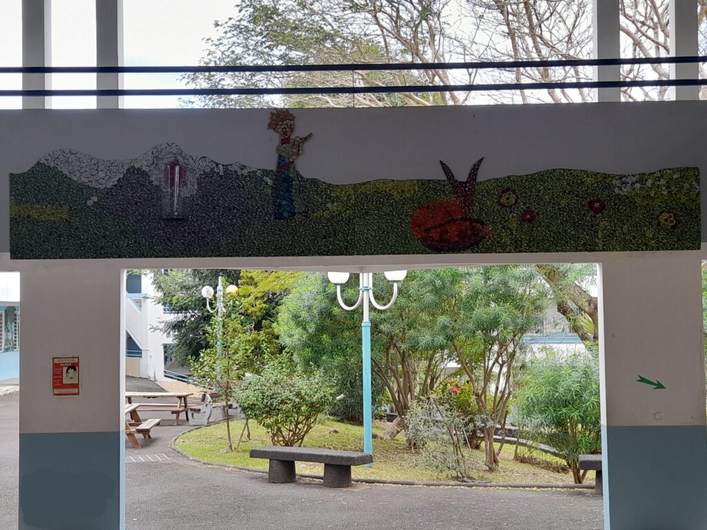 Dans le cadre de l’atelier Zéro déchet, Mme PAYET Pascale, l’artiste KanB, les membres de l’atelier Zéro déchet et leurs correspondants finlandais ont réalisé cette œuvre à l’aide de capsules de café usagés.