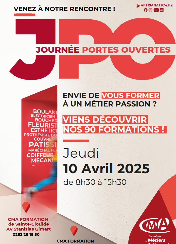 INFORMATIONS JOURNEE PORTES OUVERTES EXTERIEURE » JPO DES CENTRSE DE FORMATION DE SAINTE-CLOTILDE ET SAINT-ANDRE CHAMBRE DE METIERS le jeudi 10 avril 2025 de 8h30 à 15h30