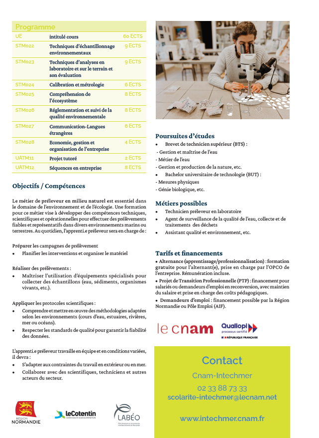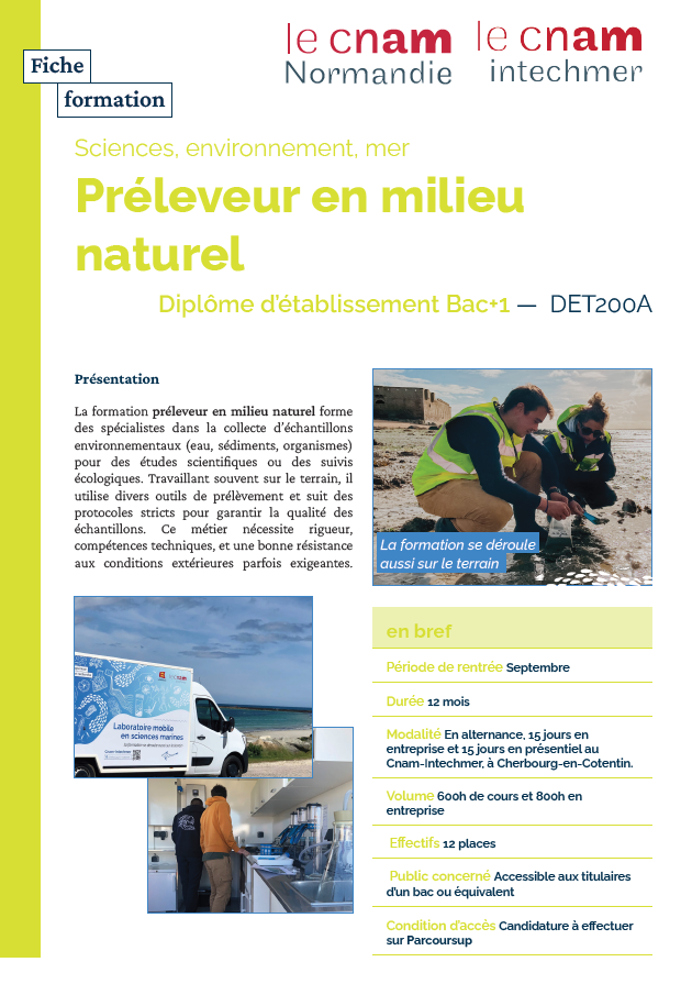 Le Cnam-Intechmer a le plaisir de vous annoncer le lancement, à la rentrée 2025, d’une nouvelle formation unique en France : le BAC+1 « Préleveur en milieu naturel ». Ce diplôme d’établissement, d’une durée de 12 mois en alternance, permet l’obtention d’un diplôme de niveau 4.