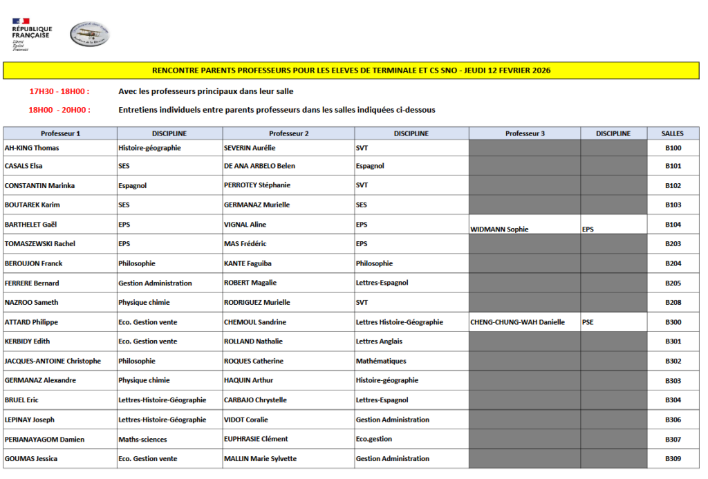 🎓Dans le cadre de l’accompagnement des élèves de terminale et de leurs familles dans la procédure Parcoursup, nous vous prions de bien vouloir prendre connaissance de l’organisation prévue pour les rencontres parents-professeurs qui se tiendront le jeudi 12 février 2026 de 17h30 à 20h.