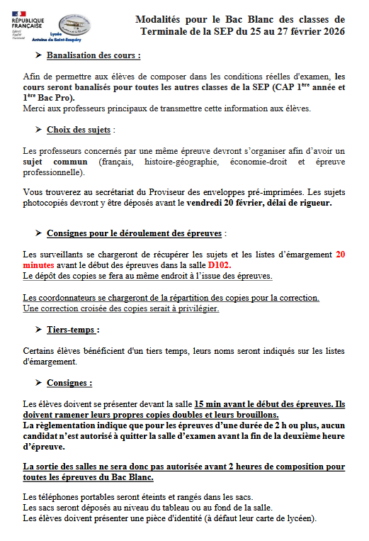 Vous trouverez ci-joint les documents nécessaires pour l’organisation du bac blanc de la SEP, prévu du 25 au 27 février 2026 :
