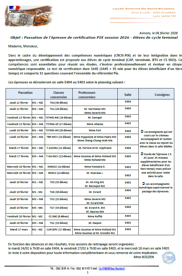 Planning de l’épreuve e certification PIX session 2026