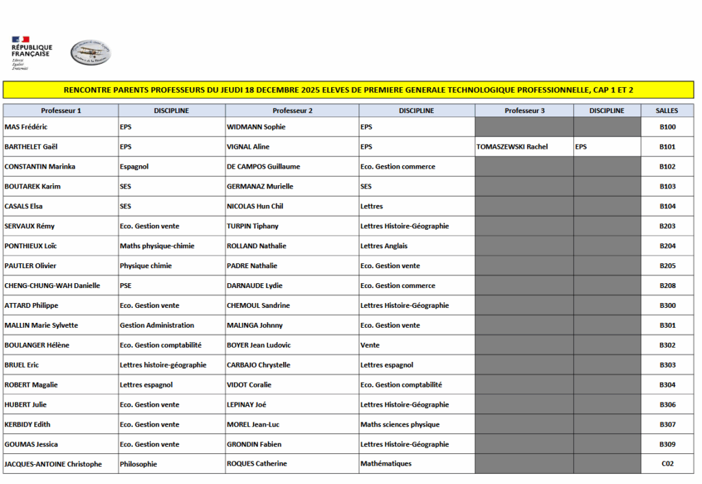 Une rencontre parents professeurs pour les élèves de première générale, technologique, professionnelle et de CAP 1 et 2 aura lieu le jeudi 18 décembre de 17h30 à 19h30.