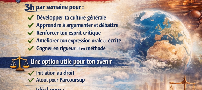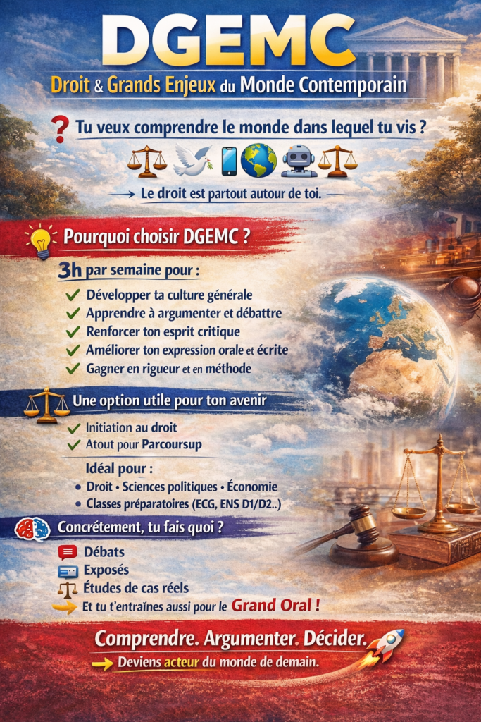 Choisir ses spécialités et ses options en terminale, c’est souvent un casse-tête. Pourtant, certaines décisions peuvent réellement faire la différence. L’option Droit et grands enjeux du monde contemporain (DGEMC) en fait partie. D’abord, parce qu’elle te permet de comprendre ce qui t’entoure. Aujourd’hui, les grandes questions de société sont partout…