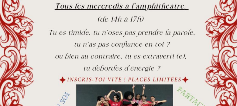 Elle s’adresse à tous les élèves qui le souhaitent (qu’ils se sentent littéraires ou non) sur chaque niveau : seconde, première et terminale, dans la limite de 20 élèves pour chaque groupe. Elle vous permettra de prendre confiance en vous et en l’autre, de canaliser votre énergie, de travailler efficacement…