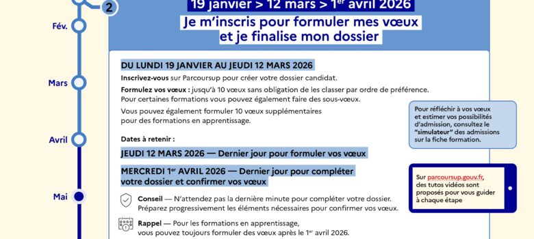 Parcoursup : des vœux à formuler à partir du mercredi 15 janvier. Date limite : jeudi 13 mars 2025 Possibilité de compléter le dossier et confirmer les vœux jusqu’au 2 avril 2025 Lire la suite