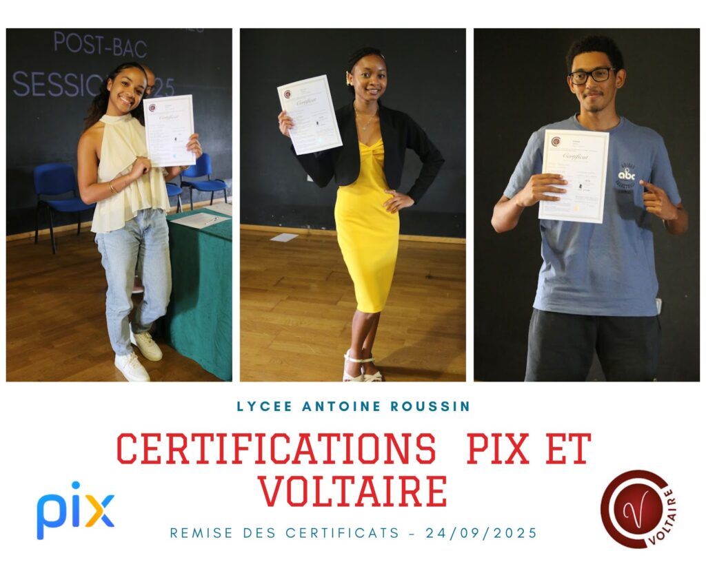 Les étudiants ont officiellement reçu leur attestation de certification Pix et Voltaire le 24 septembre 2025.
