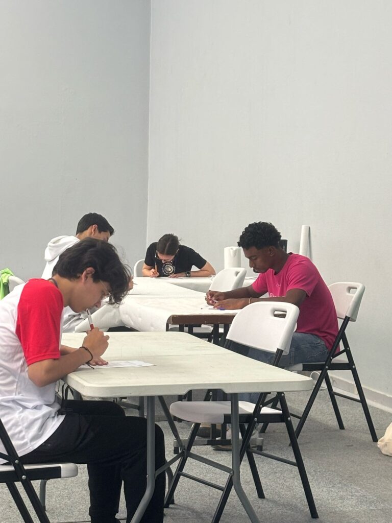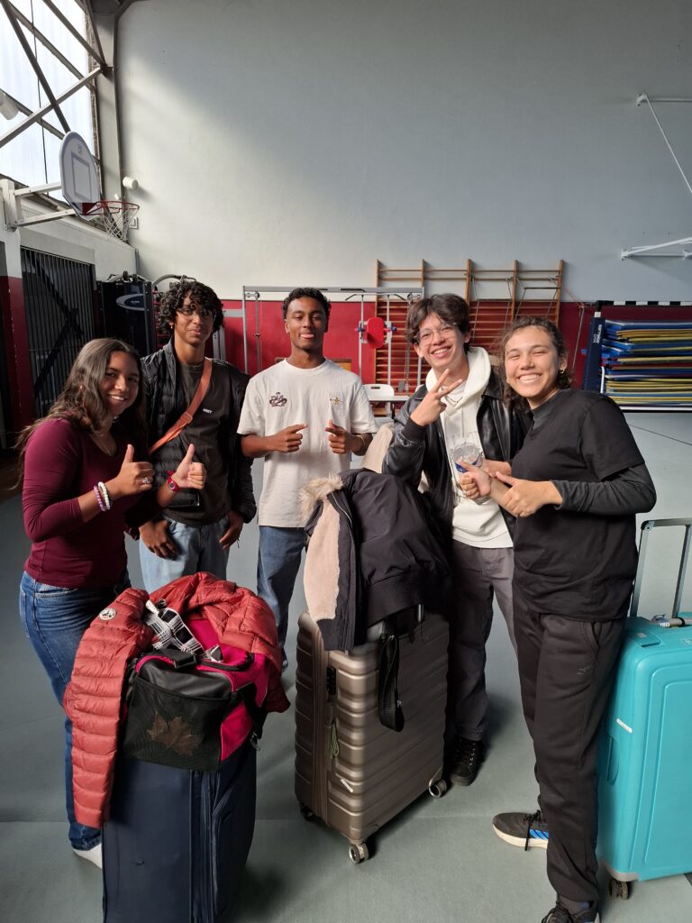 Midi. Premier repas à la cantine. Même pas de riz. Mais personne n’a l’air perturbé. Arthur prend de la tomate farçie alors qu’il déteste la tomate. Nous non plus on n’a pas compris… Les profs mangent dans une salle à part, nos élèves se fondent parmi les autres. En sortant du repas, ils ont d’ailleurs disparu… « On se sent comme chez nous » selon Shanee. Et comme à Bel-Air, ils finissent par nous retrouver : dans le gymnase.