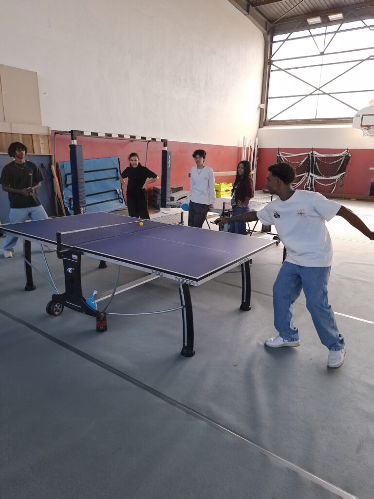 Ce lycée est immense : 3000 élèves, une petite ville. On est accueillis dans un gymnase. Il y fait chaud. On y voit des jeux, une table de ping-pong… De quoi occuper les jeunes et moins jeunes en attendant que tout soit prêt pour intégrer nos chambres à l’internat. Les tournantes de ping-pong dérivent au gré des règles : prise « à la chinoise », main gauche, sans raquette, avec téléphone… L’histoire retiendra que l’expérience a remporté la majorité des partie.