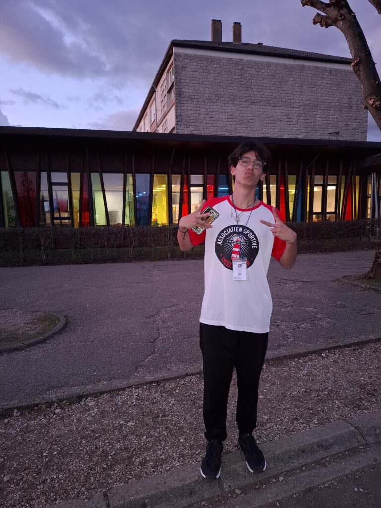 Heure du dîner, on doit faire la queue pour la cantine. Shanee a vu un cercle avec un ballon de volley alors il a agrandi le cercle. Arthur a fait croire qu’il n’avait pas froid avec son t-shirt de l’AS. Après quelques minutes on a pu entrer dans le réfectoire. On apprend alors que Léo aime beaucoup le tempérament des gens. Ca fait discrètement rire Shanee. On n’a pas tout compris.