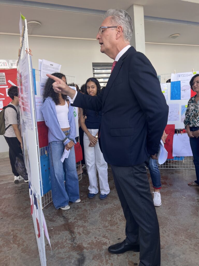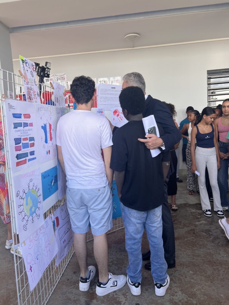 Sous la houlette de la référente laïcité de l’établissement, Mme Clain, nos élèves ont présenté leurs travaux autour de leurs représentations de la laïcité, ce qui a permis de beaux échanges entre le professeur de droit qu’était M. le Recteur et nos jeunes en devenir : Kenjee (102), un des ambassadeurs laïcité, a guidé notre hôte vers Lamia (1POBM) qui a ainsi pu donner sa définition de la laïcité sous forme de dessin, vers Antoine (201) a pu justifier avec brio son choix de représenter l’article 3 de La Charte de la Laïcité sous forme d’arbre, vers Carpanin (201) qui a présenté un travail en allemand sur la laïcité en Europe ou encore vers Kéran (1CMET) qui a présenté avec fierté le cahier laïque de sa classe et des secondes professionnelles.
