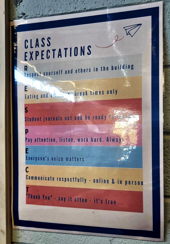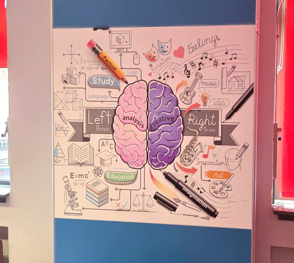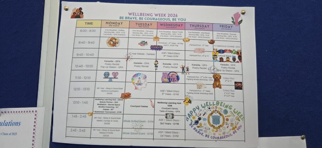 La notion de bien-être à l’école prend pour nous tout son sens lorsque nous pénétrons dans la très lumineuse salle des professeurs qui est grande et plutôt accueillante. Cerise sur le gâteau, nous sommes en pleine semaine à thème « WELLBEING WEEK 2026 – BE BRAVE, BE COURAGEOUS, BE YOU ». Cette semaine du bien-être s’adresse à tous, adultes comme élèves et s’il ne s’agit pas ici de vous détailler leur programme, la clôture d’un tel programme par la présence des chiens des élèves et professeurs interroge fortement sur nos interdits français dans l’enceinte de l’école. Une forte leçon de savoir-vivre ensemble…