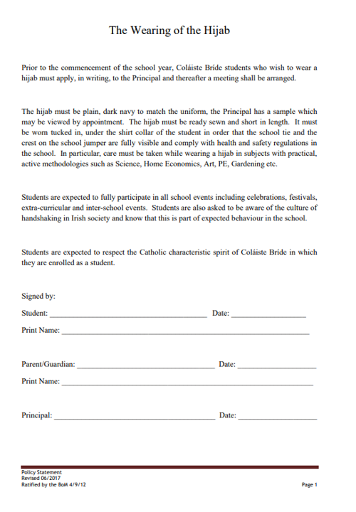 La charte école/famille sur le port du voile est dans ce sens plutôt intéressante (le voile doit être de couleur noire et ne doit pas dépasser le milieu du dos. Dans certaines matières, l’enseignant peut demander à ce qu’il ne soit pas porté. En aucun cas l’élève porteuse du voile ne peut justifier d’une dispense pour la célébration des fêtes traditionnelles et irlandaises. Il est attendu de l’élève qu’elle respecte l’orientation catholique de l’école).