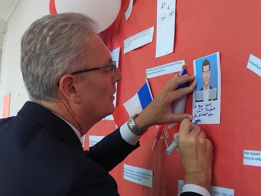 Sous la houlette de la référente laïcité de l’établissement, Mme Clain, nos élèves ont présenté leurs travaux autour de leurs représentations de la laïcité, ce qui a permis de beaux échanges entre le professeur de droit qu’était M. le Recteur et nos jeunes en devenir : Kenjee (102), un des ambassadeurs laïcité, a guidé notre hôte vers Lamia (1POBM) qui a ainsi pu donner sa définition de la laïcité sous forme de dessin, vers Antoine (201) a pu justifier avec brio son choix de représenter l’article 3 de La Charte de la Laïcité sous forme d’arbre, vers Carpanin (201) qui a présenté un travail en allemand sur la laïcité en Europe ou encore vers Kéran (1CMET) qui a présenté avec fierté le cahier laïque de sa classe et des secondes professionnelles. Le Recteur s’est ensuite prêté au jeu en signant son avatar sur le panneau des 120 visages