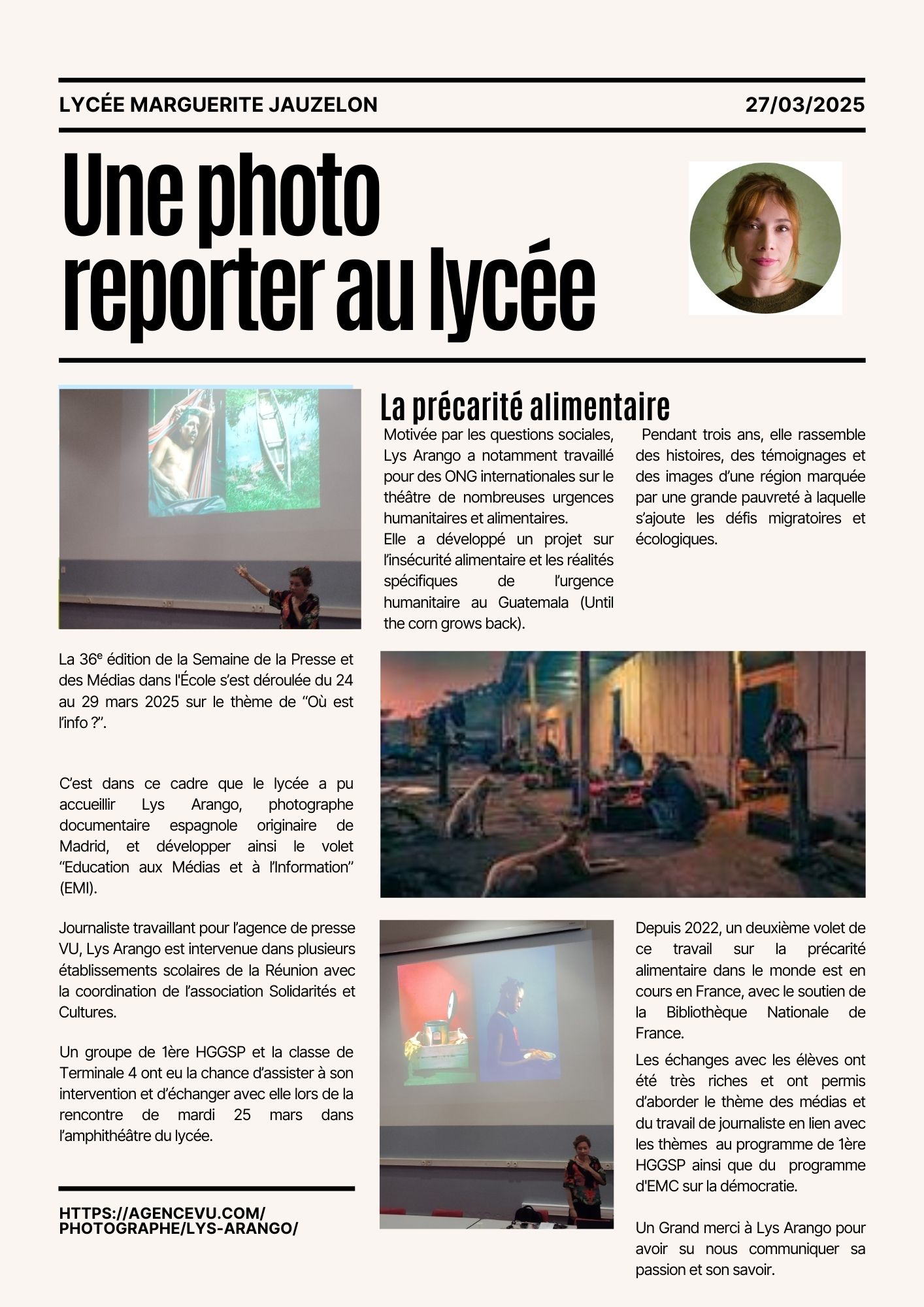 Dans le cadre de la Semaine de la Presse, du 24 au 29 mars 2025, nous avons eu le plaisir d’accueillir au lycée la photo reporter Lys Arango