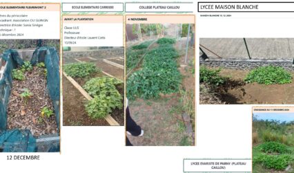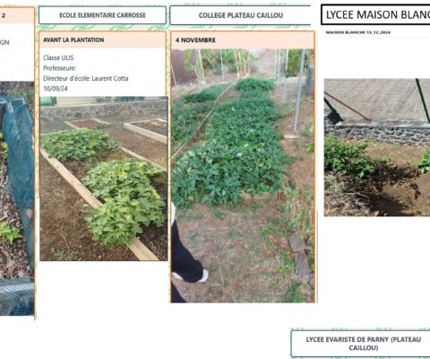 Ce projet a été réalisé entre les bâtiments C et B juste à l’arrière d’un préau, avec plusieurs éco-délégués (Séphora, Elise, Maël, Romane et Liam), les référentes EDD (Mme Hoareau et Mme Payet) et une agent du lycée (Mme Métanire). La mise en place a été faite en plusieurs étapes afin de participer à la revégétalisation du lycée, et, à terme, récolter les patates douces et développer le potager, notamment avec une plantation de palmiers.
