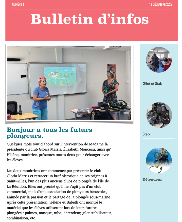 Dès lors, avec nos 22 élèves inscrits à ce jour, nous organiserons une première séance d’initiation dans le lagon de Saint-Pierre afin de les familiariser avec l’environnement subaquatique. Avant de se lancer dans leur baptême de plongée bouteille en profondeur, cette étape préparatoire a pour objectif de les initier progressivement aux gestes techniques fondamentaux indispensables à une pratique sûre et maîtrisée.