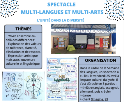 Redécouvrez le spectacle « multi‐langues et multi‐arts » qui s’est tenu le 25 avril à l’espace culturel du lycée dans le cadre de la Semaine des Langues. Trois parties (théâtre en anglais, espagnol, allemand et créole ; danse ; chant) pour promouvoir tolérance, amitié et inclusion, avec une cinquantaine d’élèves, leurs enseignants et le personnel du lycée Continuer de lire