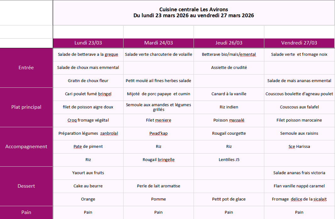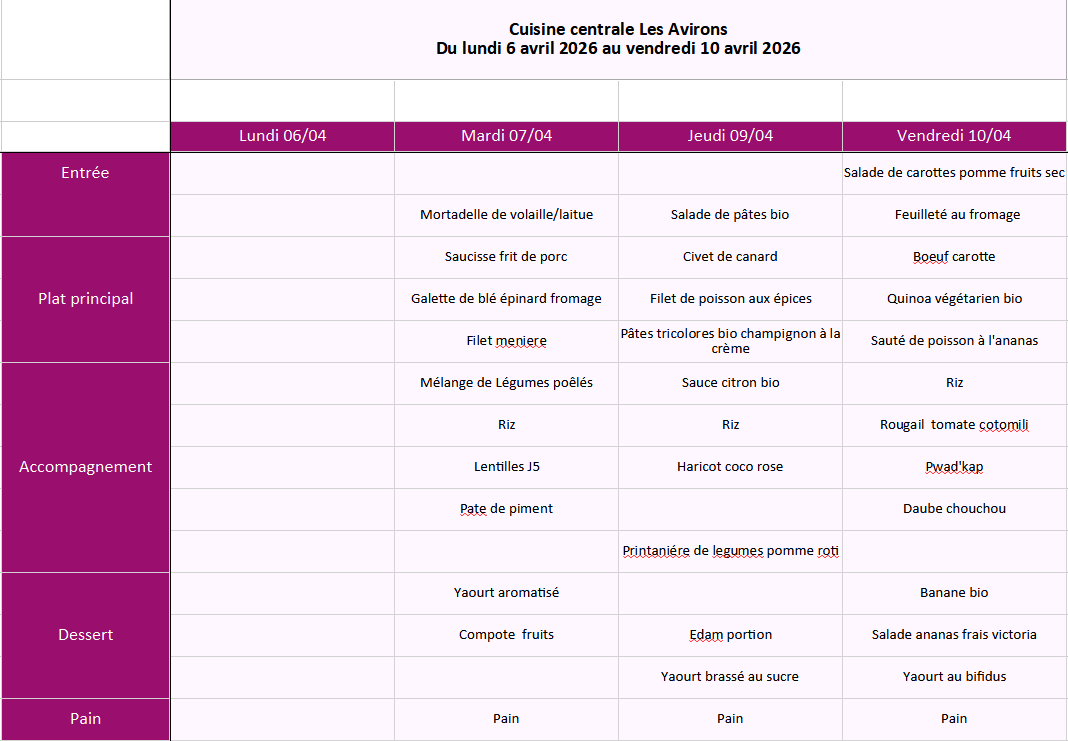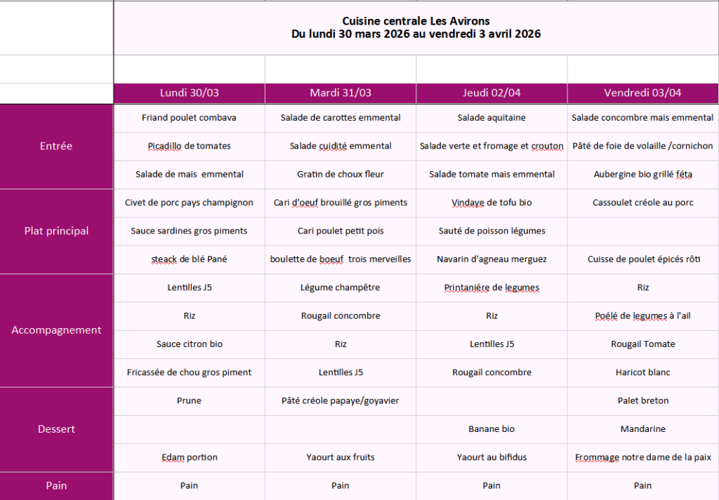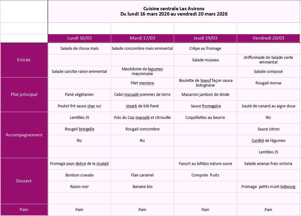 Découvrez les menus du 16 mars 2026 au 10 avril 2026.