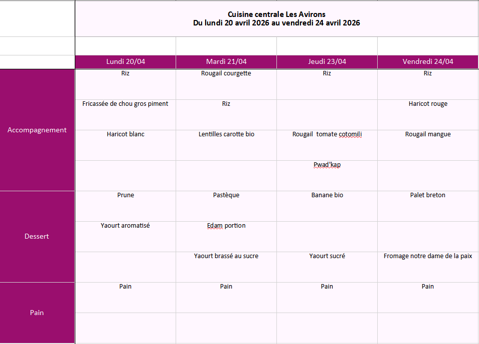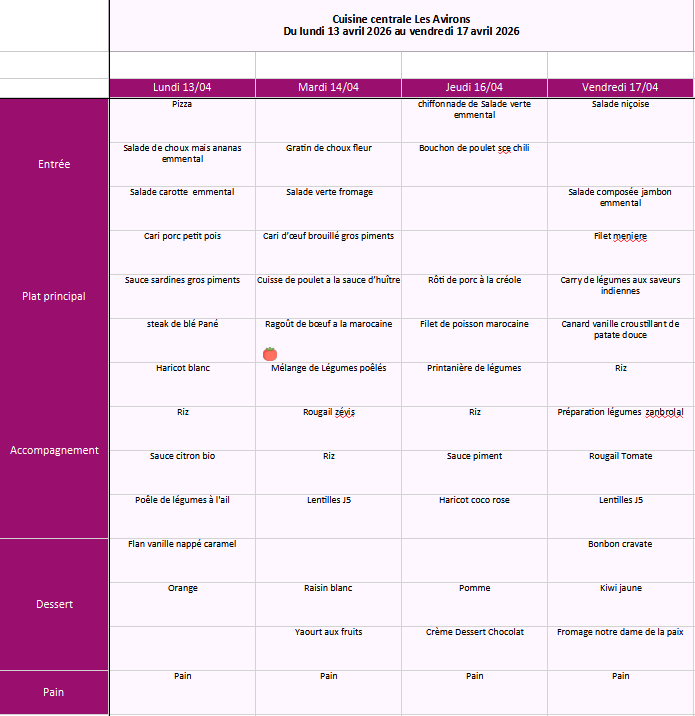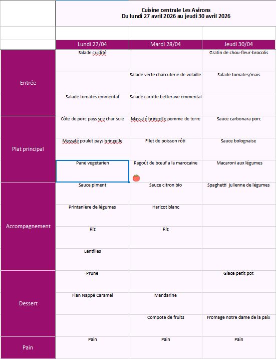 Découvrez les menus du 06 avril 2026 au 30 avril 2026.