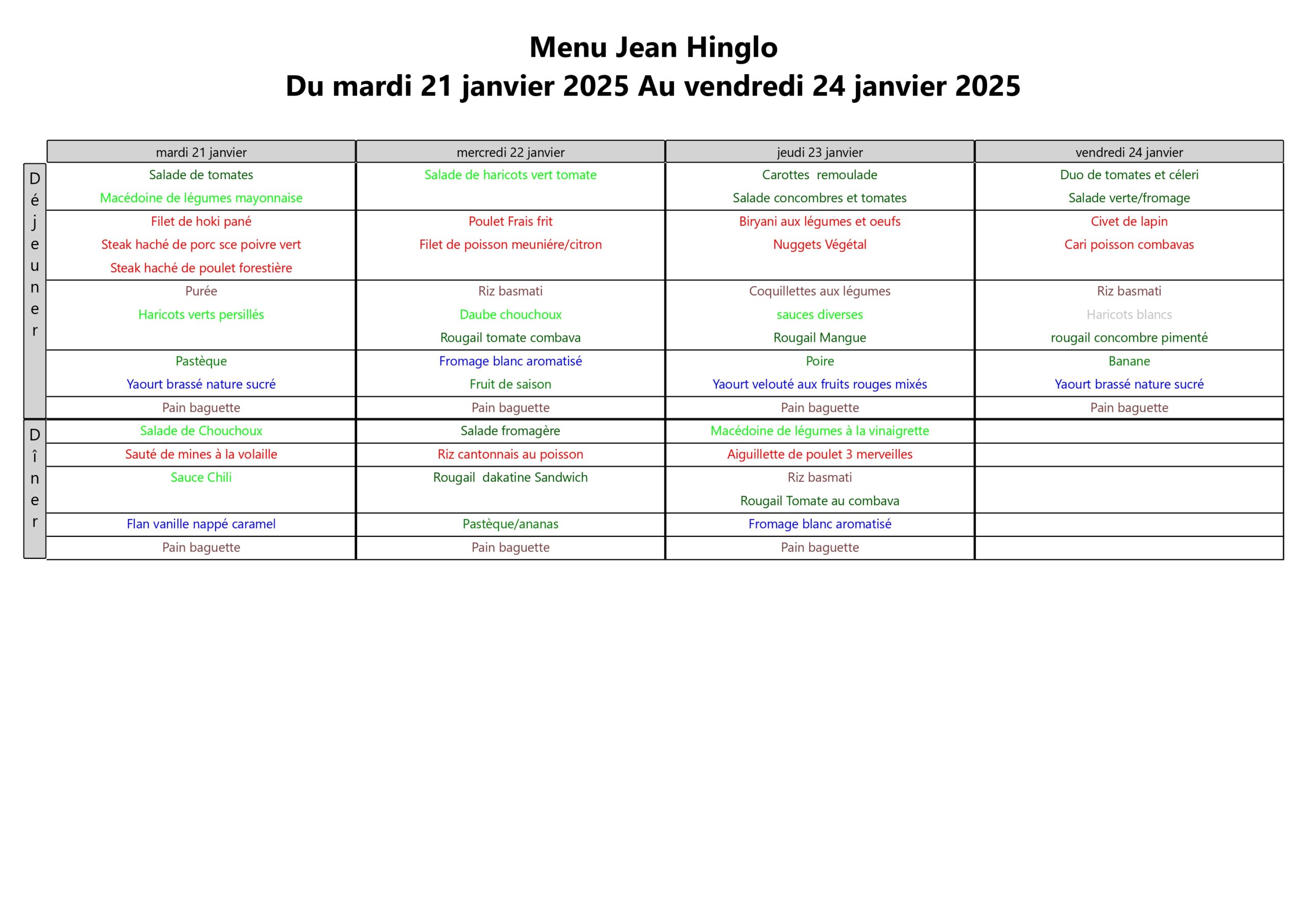 Accueil»Menus»Restaurant scolaire : Menus du mardi 21 au vendredi 24 janvier 2025