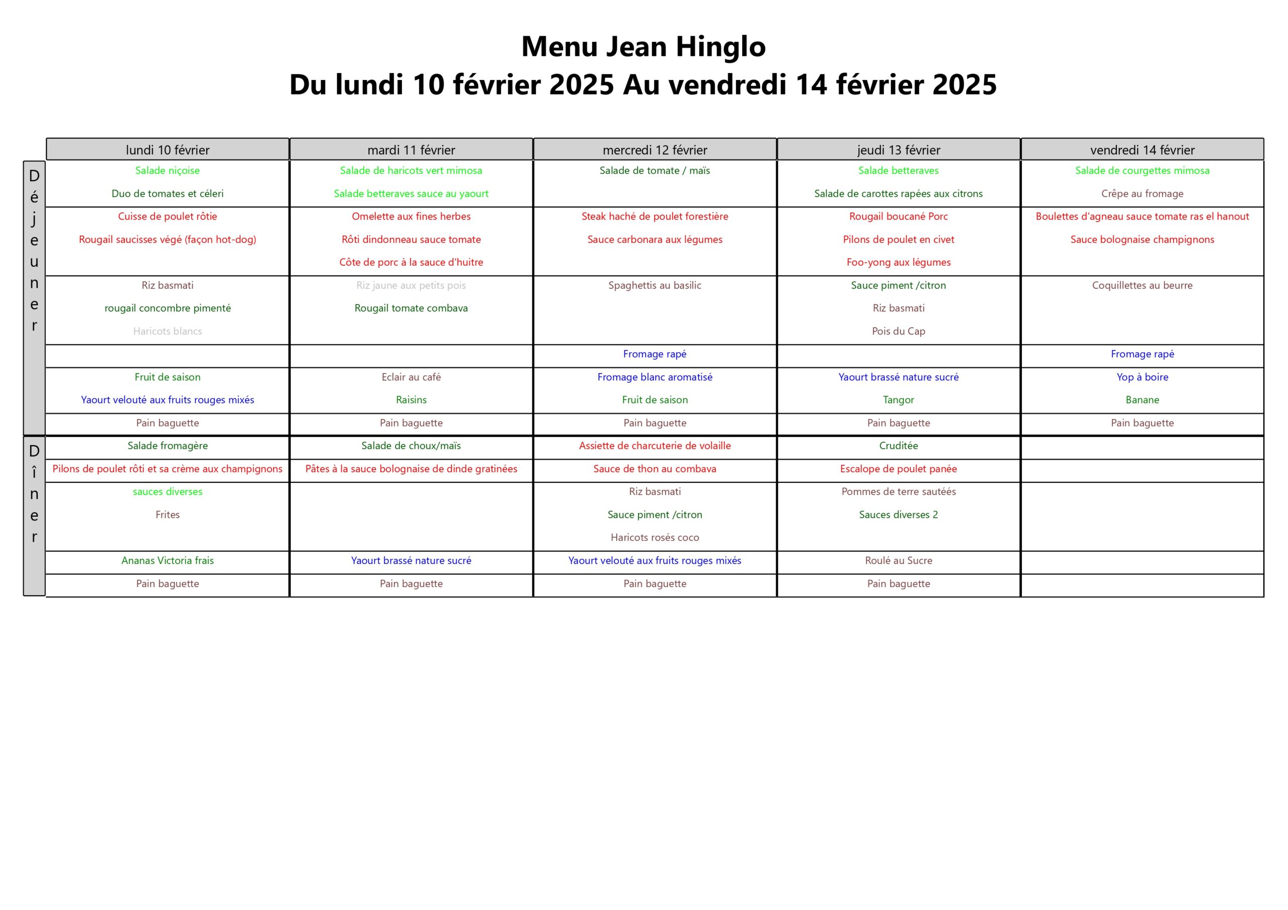 Restaurant scolaire : Menus du lundi 10 au vendredi 14 février 2025