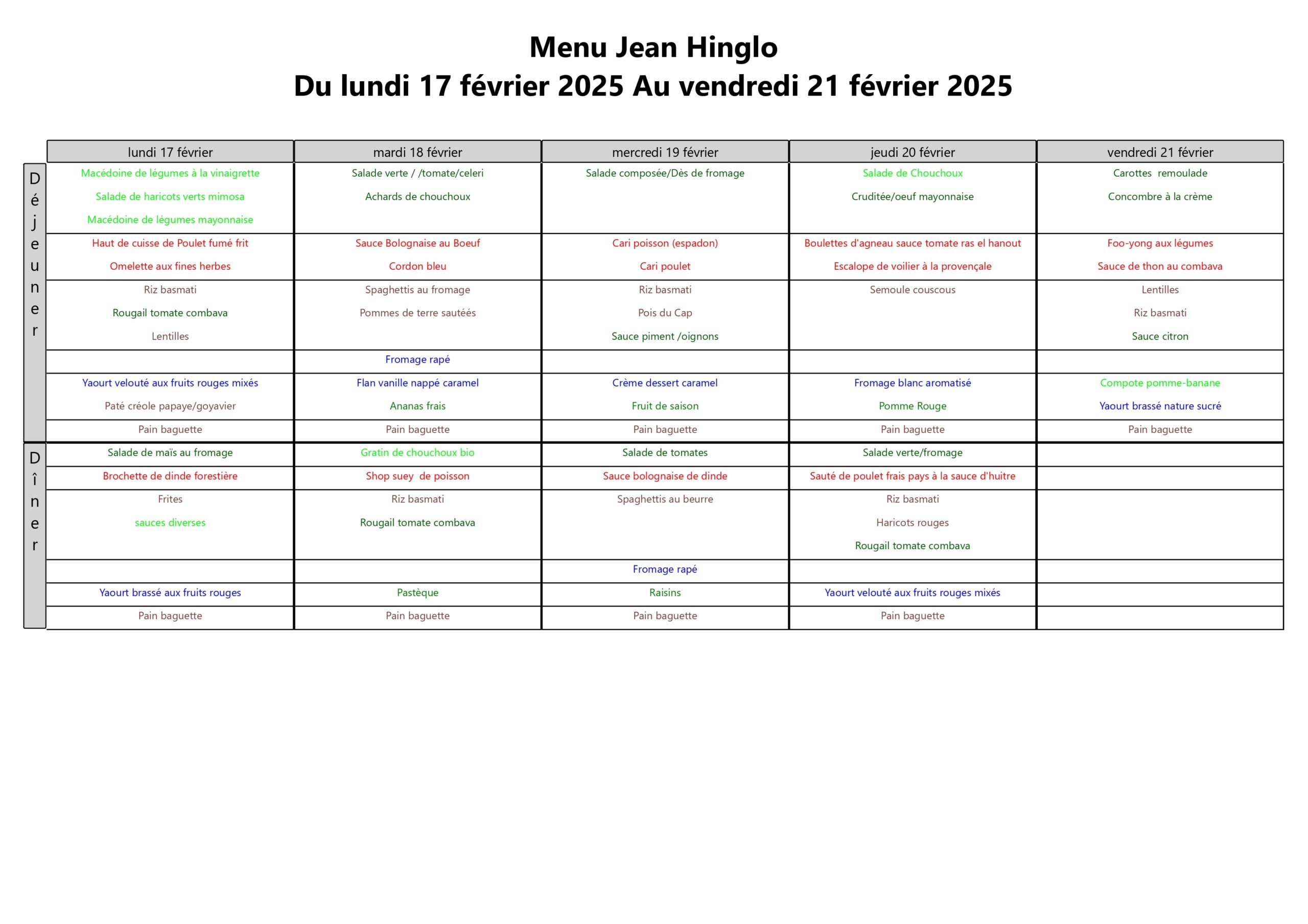 Restaurant scolaire : Menus du lundi 17 au vendredi 21 février 2025