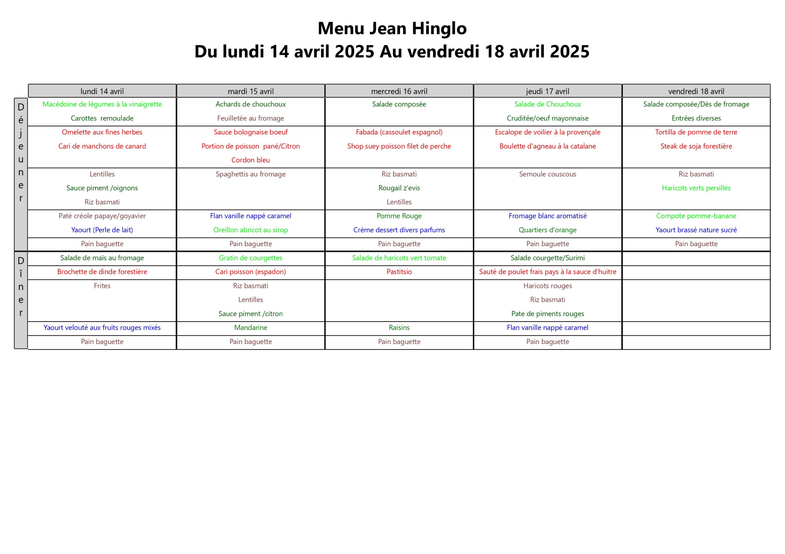 Restaurant scolaire : Menus du lundi 14 au vendredi 18 avril 2025